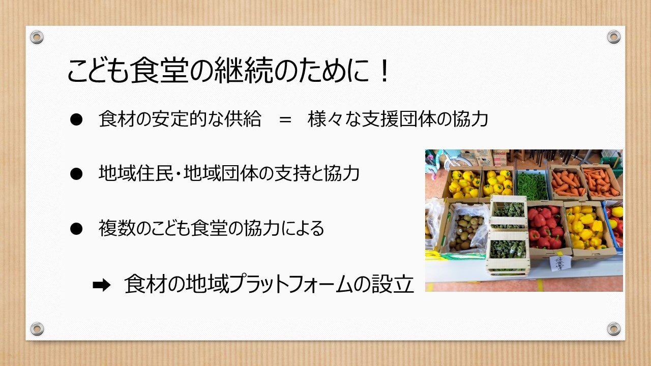 東淀川区の淡路で月1回、こども食堂を開催しています。コロナ禍ではお弁当配布で対応し、食材配布の活動も実施しました。地域で活動を応援いただいている多くの企業・組合に支えられ、活動ができています。 こども食堂の継続のためには、食材の地域プラットフォームの確立が必要と考えます。