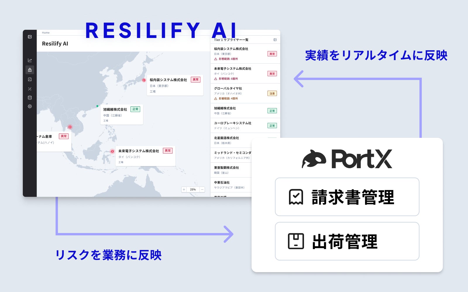 株式会社PortX(以下「PortX」)は、グローバルなサプライチェーンにおけるリスク管理のデジタル化を目的としたサプライチェーンリスクマネジメント(SCRM)領域への参入を発表いたします。これに伴い、新サービスである「Resilify AI(レジリファイ・エーアイ)」の開発に着手し、今後、先行ユーザー向けのβ版の提供開始および市場導入に向けた取り組みを進めてまいります。