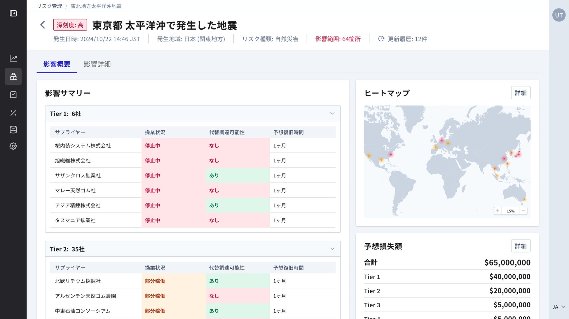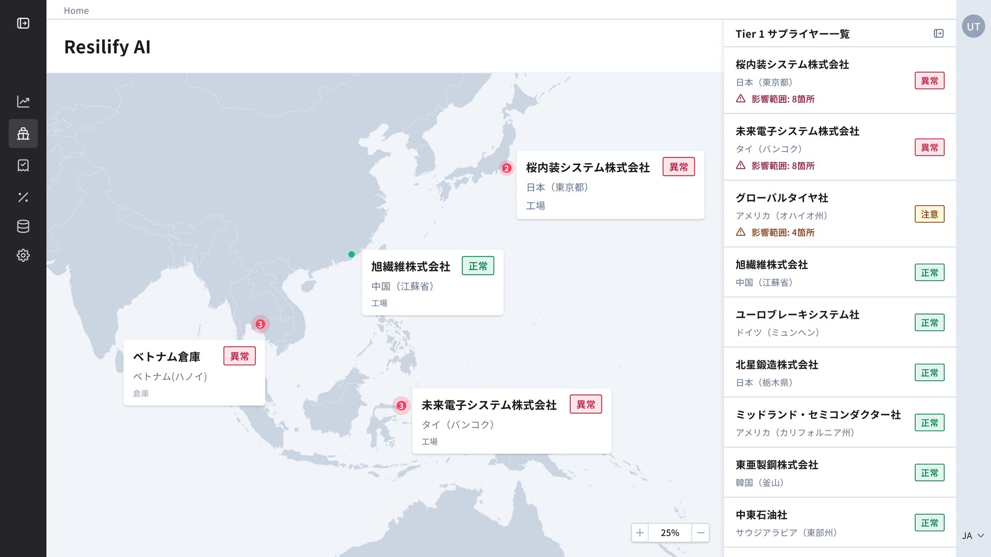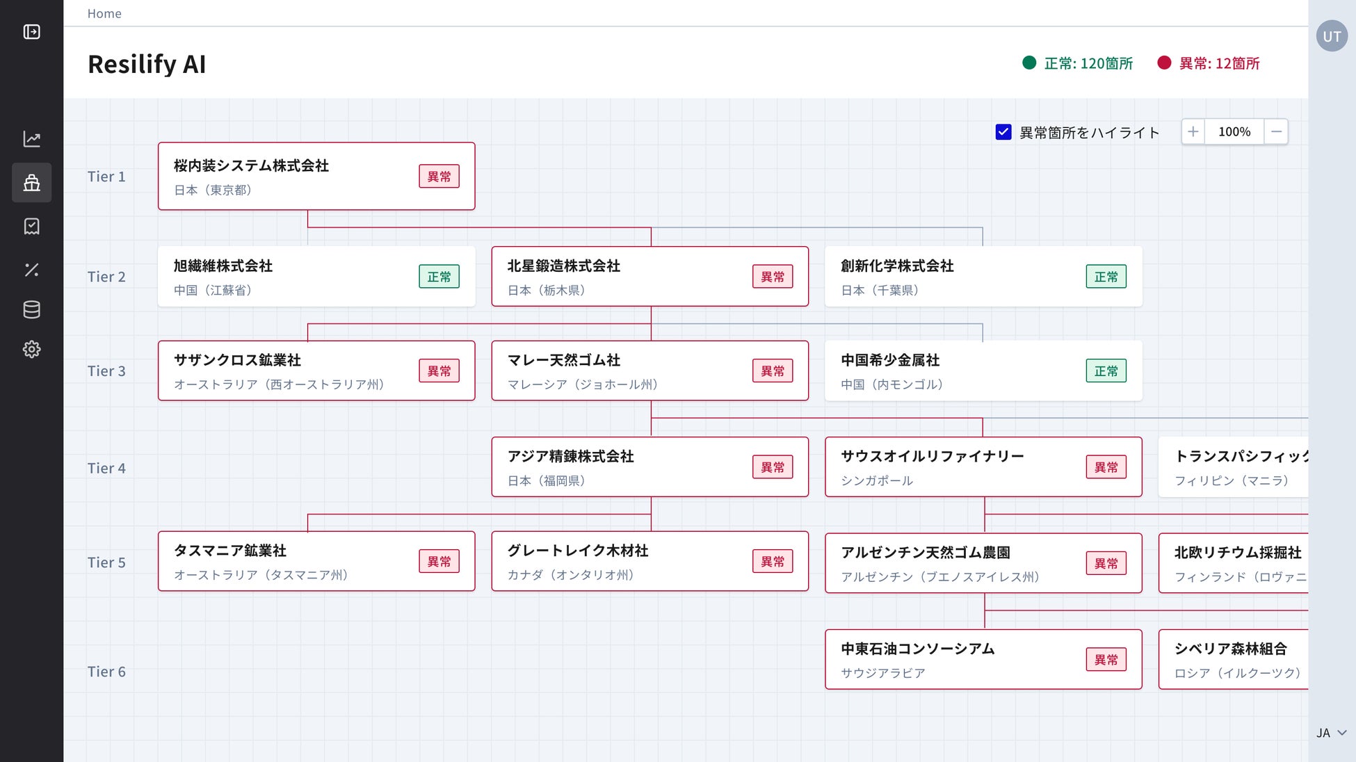 企業のサプライチェーンをAIによって一次サプライヤー(Tier1)だけでなく、二次(Tier2)、三次(Tier3)サプライヤーまで含めた「マルチティア」で可視化。リスク発生時の影響範囲を迅速に把握し、適切な対策を講じることが可能になります。