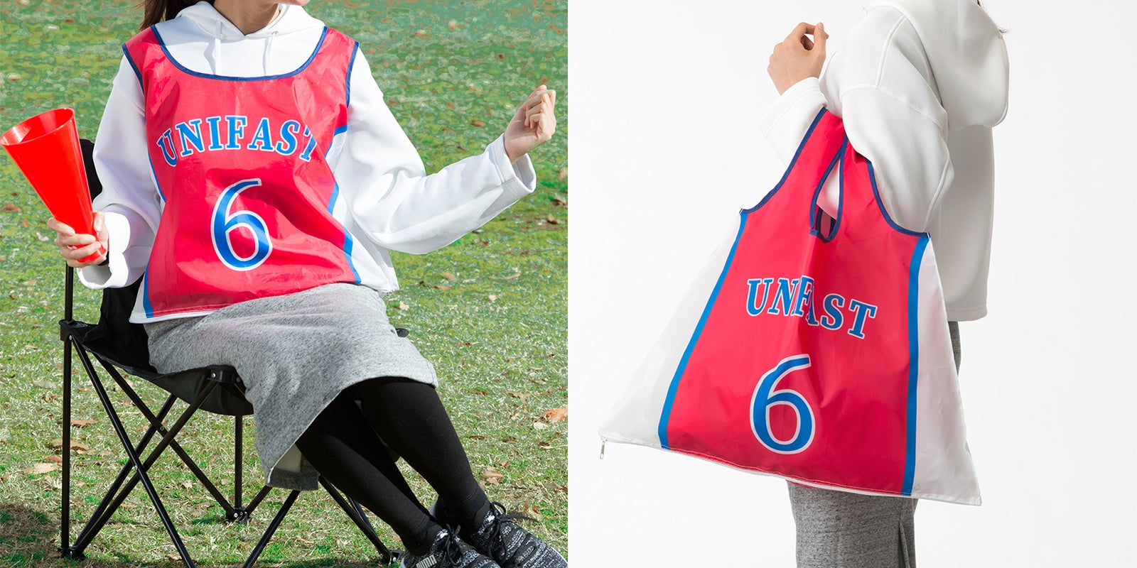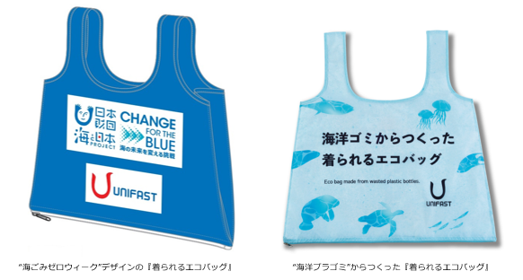 (※『着られるエコバッグ』とは、エコバッグの底がファスナーになっていて、閉じればバッグに、開ければビブスやユニフォームとして着られる仕組みになっている環境にやさしい2WAY仕様。当社が開発し、実用新案取得済み。)