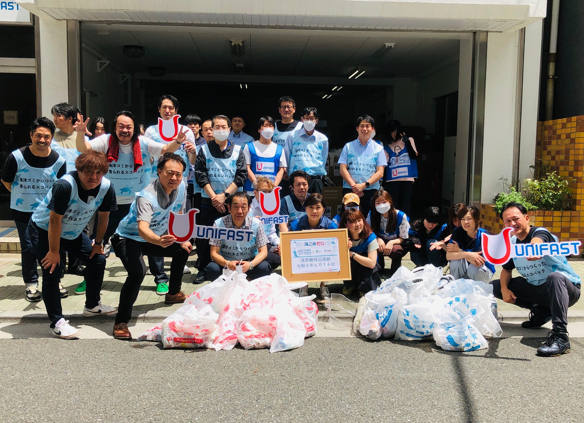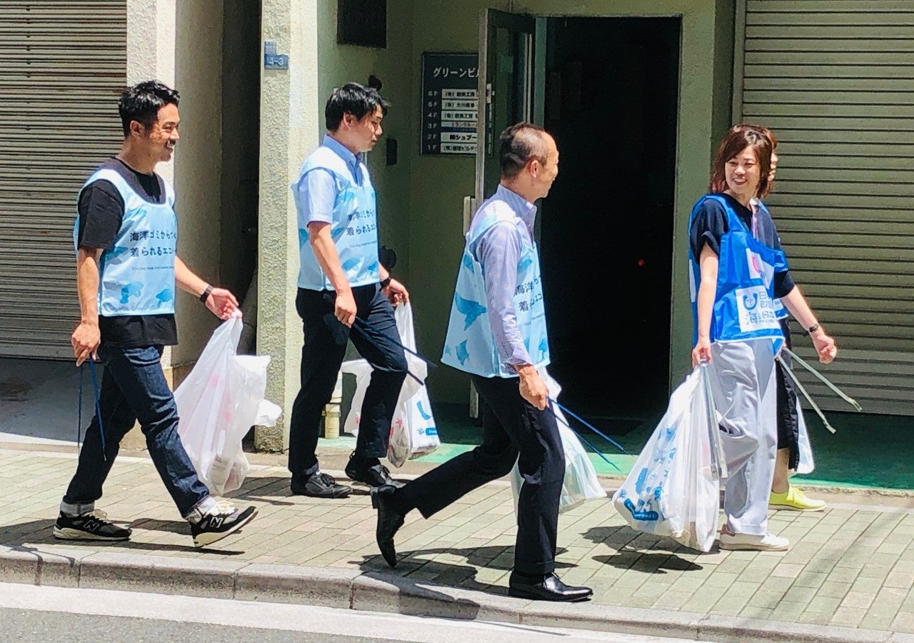 “海洋プラゴミ”からつくった自社開発の『着られるエコバッグ』着用 5回目となる「海ごみゼロウィーク」清掃活動を実施 地域貢献や環境問題の啓発に寄与 浅草橋の本社周辺にて 6月16日