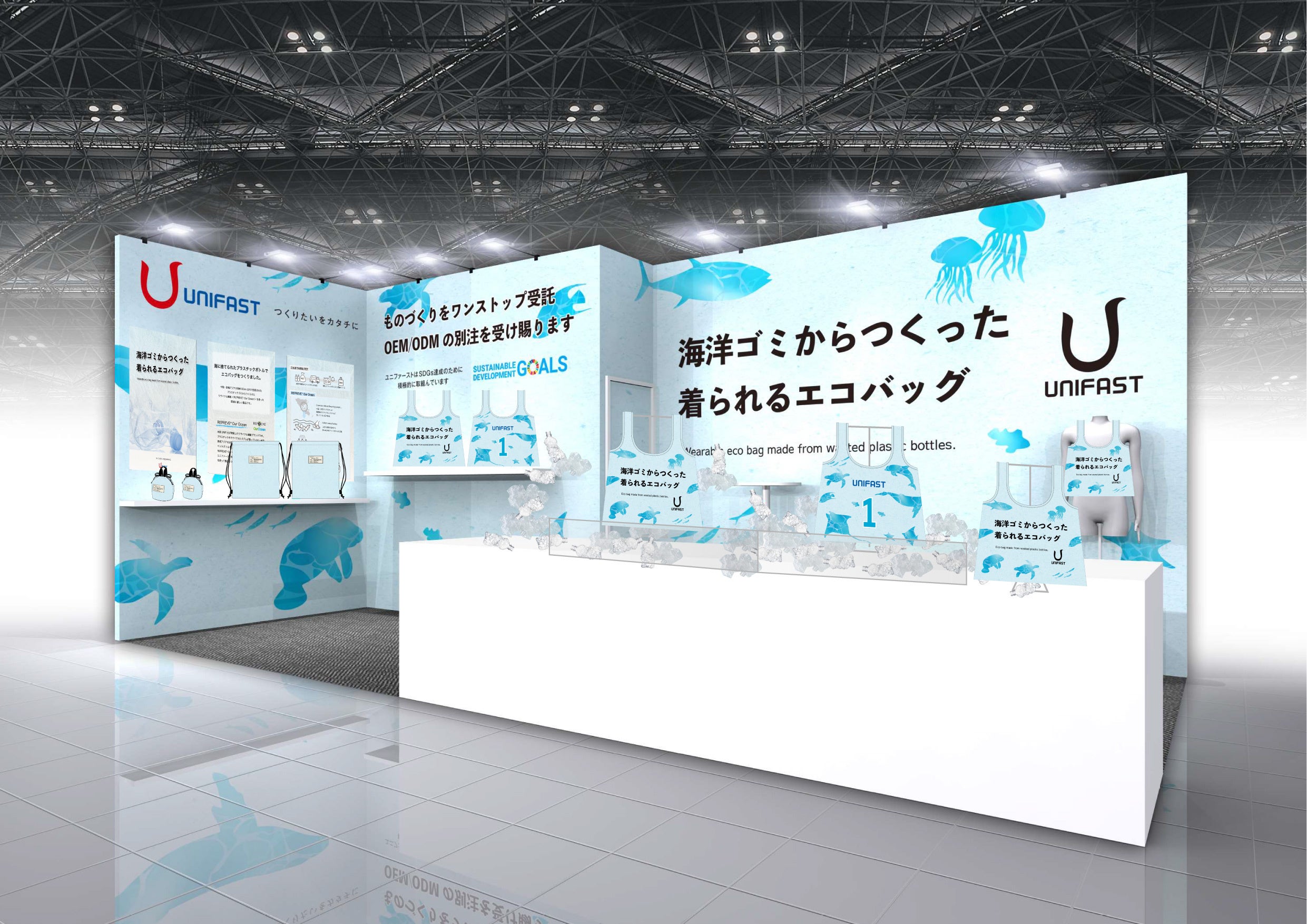 応援グッズの新定番『着られるエコバッグ』と“海洋プラゴミ”からつくったリサイクル繊維のコラボでスポーツビジネス産業展に出展