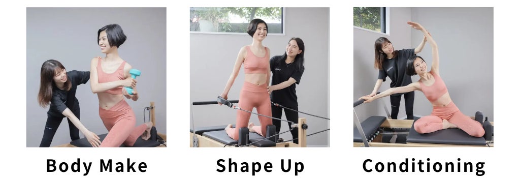 - シェイプアップ:軽重量やピラティスマシンでのトレーニングを中心とし、ウエストラインなど身体の部分でメリハリをつけたいという部位を中心にトレーニングを行います。
