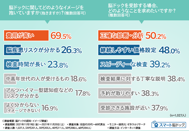 2021年11月にスマートスキャンが全国の20~60歳代1,027人を対象に実施した「脳ドック」の認知・イメージ調査では、「脳ドックを知っている」割合は、20代~30代の若い世代は3割台、40代以上も半数程度と、脳ドックの認知度はまだまだ低いことが分かりました。また、イメージについては「費用が高い(69.5%)」という回答が最も多く、次いで「脳疾患リスクが分かる(26.3%)」「検査時間が長い(23.8%)」「中高年世代の人が受けるもの(18.6%)」という結果でした。