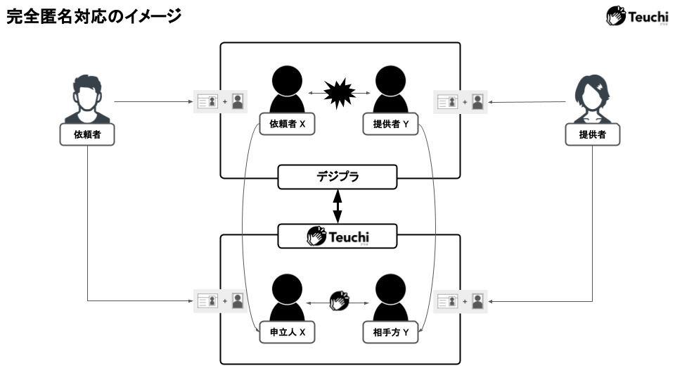 最大の特徴は、これまでの民事訴訟の枠組みでは実現し得なかった「完全匿名」による紛争解決を可能にした点です。Teuchi for デジプラでは紛争当事者双方の本人確認を厳格に実施しますが、氏名・住所・メールアドレスなどの個人情報を相互に秘匿したまま、デジタルプラットフォーム上でのIDやニックネームのみで手続きを進めることができます(※4)。