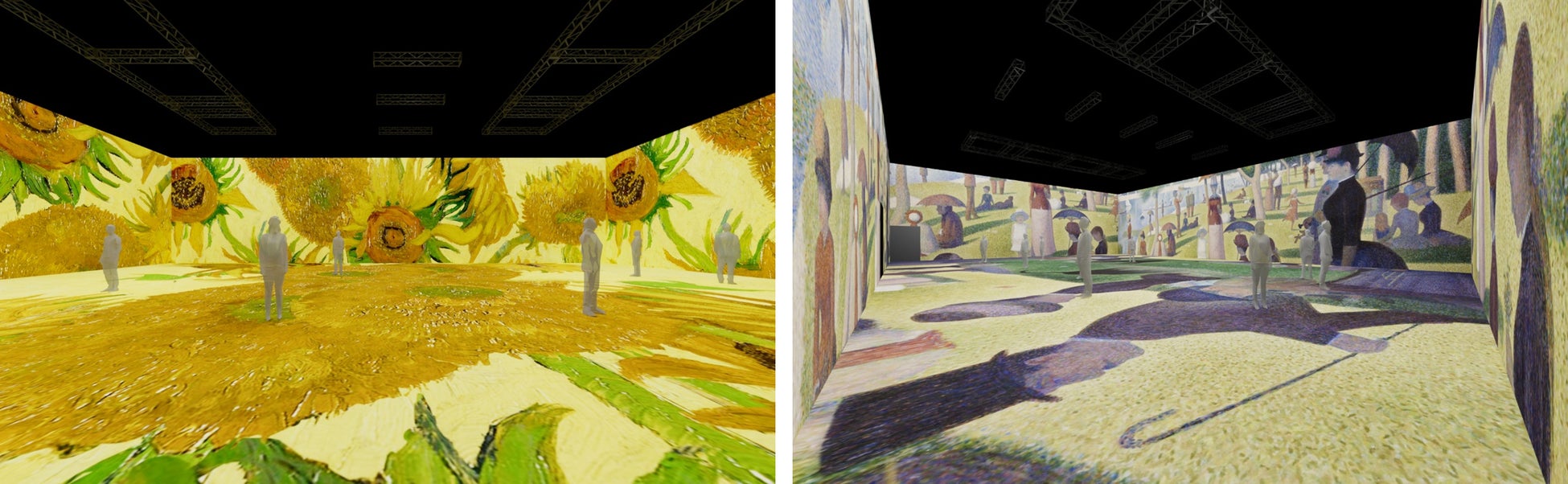 世界的に著名な芸術作品を映像コンテンツ化し、広大な屋内空間の壁面と床面全てを埋め尽くす没入映像と特別な音響体験を提供する新感覚体験型アートエキシビションです。従来の「鑑賞型」の芸術鑑賞のスタイルから「没入型」のスタイルを提供し、来場者に新たな芸術鑑賞の「視点」を提示します。従来の美術館のようなアナログアートから、最先端のデジタルアートへ新時代のアートコンテンツを展開し、日本のアート体験を拡張する“アート2.0”の象徴が「Immersive Museum」です。