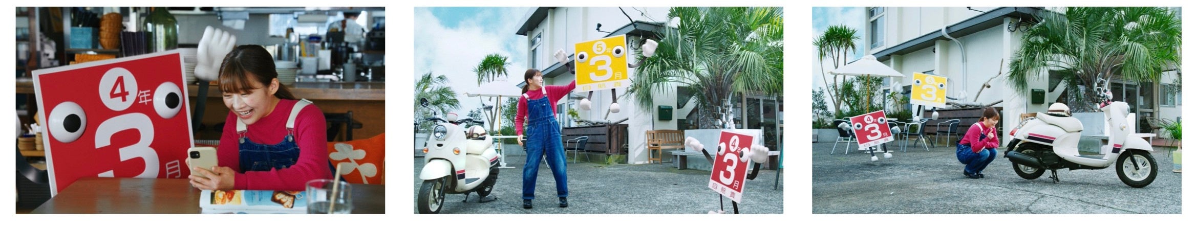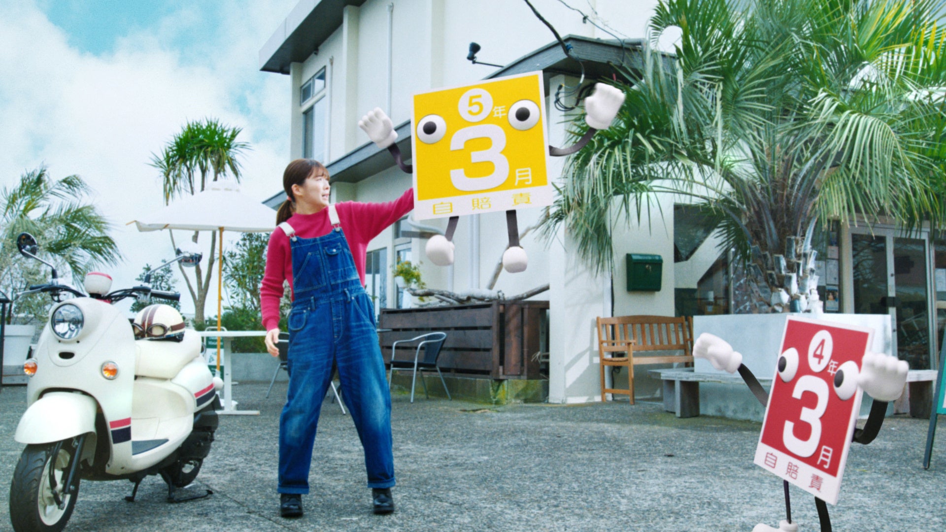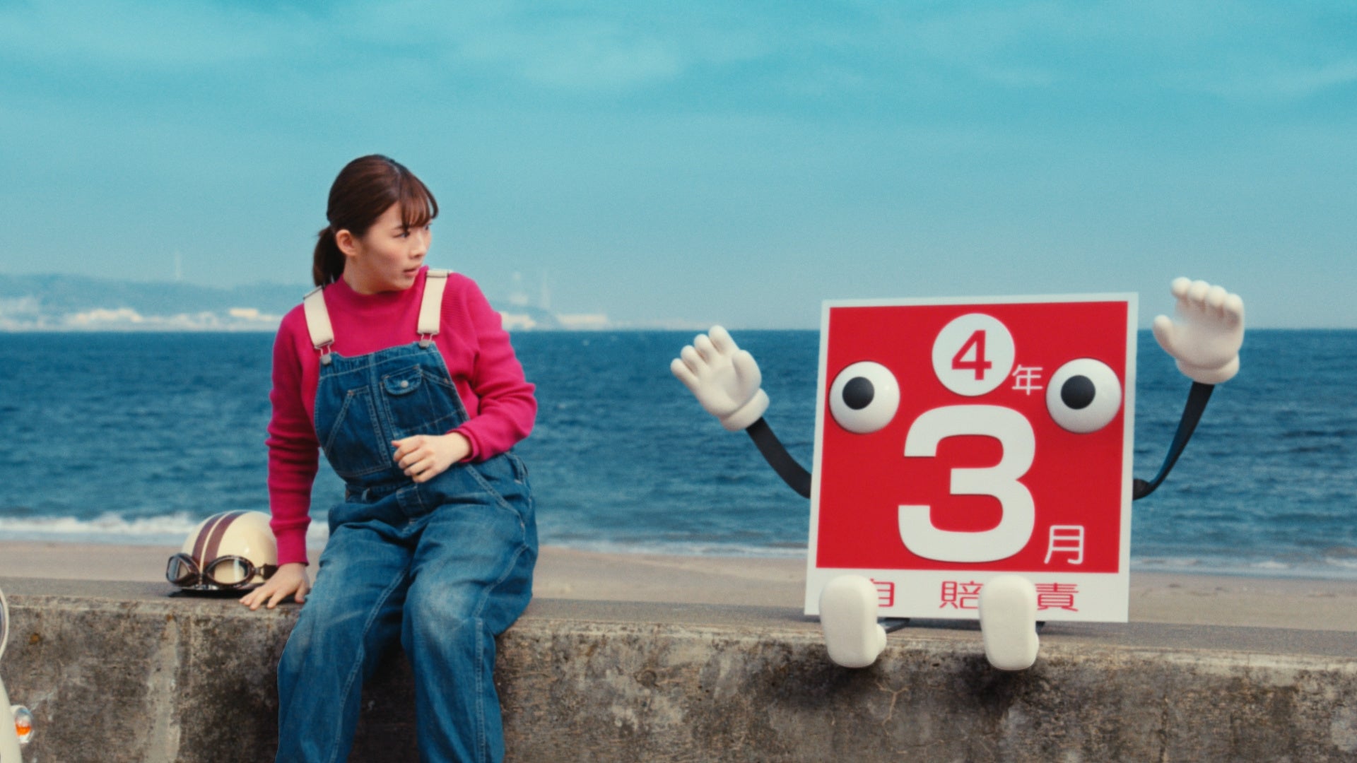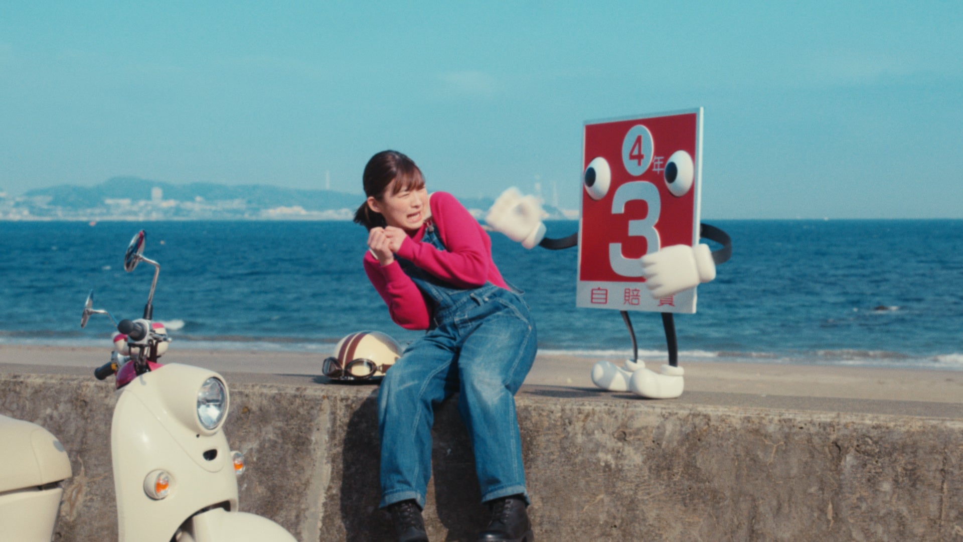 海辺やカフェでくつろぐ伊藤沙莉さんが、「バイクに乗る人のそばで、安全を願う優しいやつ」である“ステッカーくん”からツッコミを受け、赤色のステッカーがもうすぐ更新であること、スマホで更新が出来ること、電動キックボードも対象であることなど、自賠責保険について学びます。お笑いコンビさながらの、息の合ったやりとりにご注目ください。