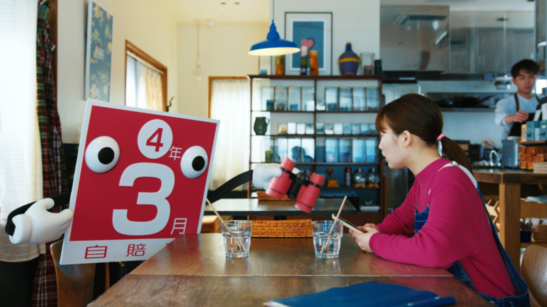 カフェでスマホを操作している伊藤さん。“ステッカーくん”が「そろそろ自賠責保険、更新の時期やで」と話しかけると、「めんどくさそう~」と一言。“ステッカーくん”は「スマホでラクラクや!」と、更新手続きがスマホから出来ることを伝えます。更新後のカラーである黄色の“ステッカーくん”が登場し、「これからよろしくね!」と背中に触れる伊藤さん。黄色の“ステッカーくん”が手にくっついてしまうハプニングが起きるも、無事に更新が完了します。