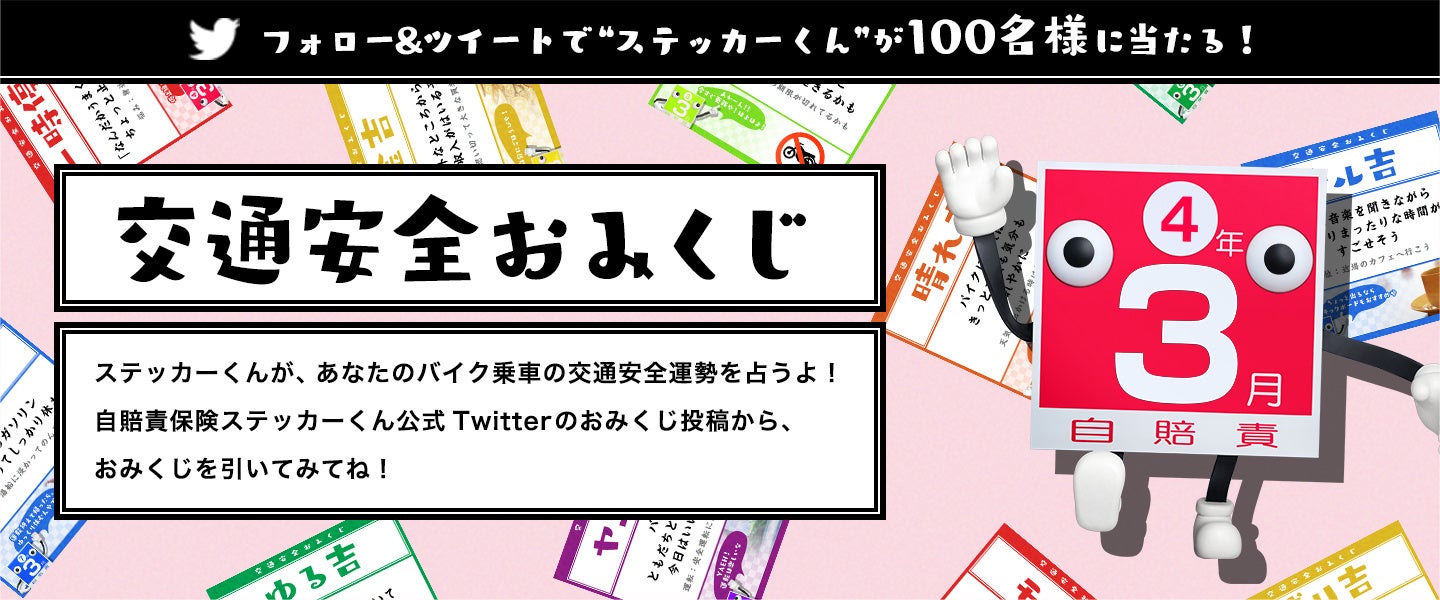 自賠責保険ステッカーくんの交通安全おみくじキャンペーンとして、フォロー&ツイートで“ステッカーくん”が100名様に当たる!Twitterキャンペーンもスタートします。