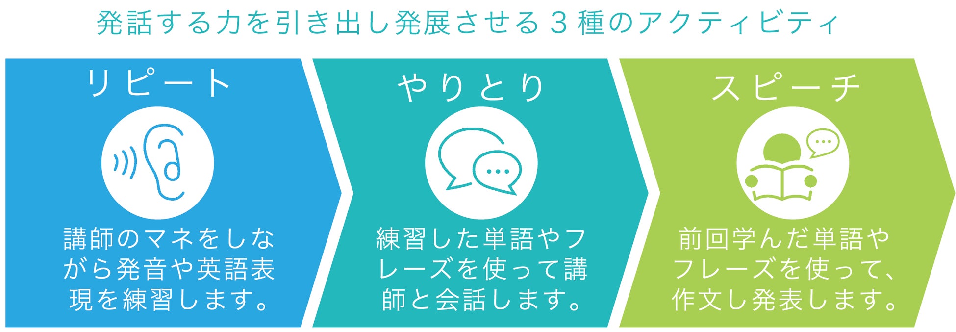 HATSUWA+のレッスンは講師ではなく、お子様が英語を話す時間が長くなるよう設計されています。「第二言語習得論」に基づいたメソッドで、学習した語彙・フレーズ・文法を使って、徹底的に話す力を引き出します。