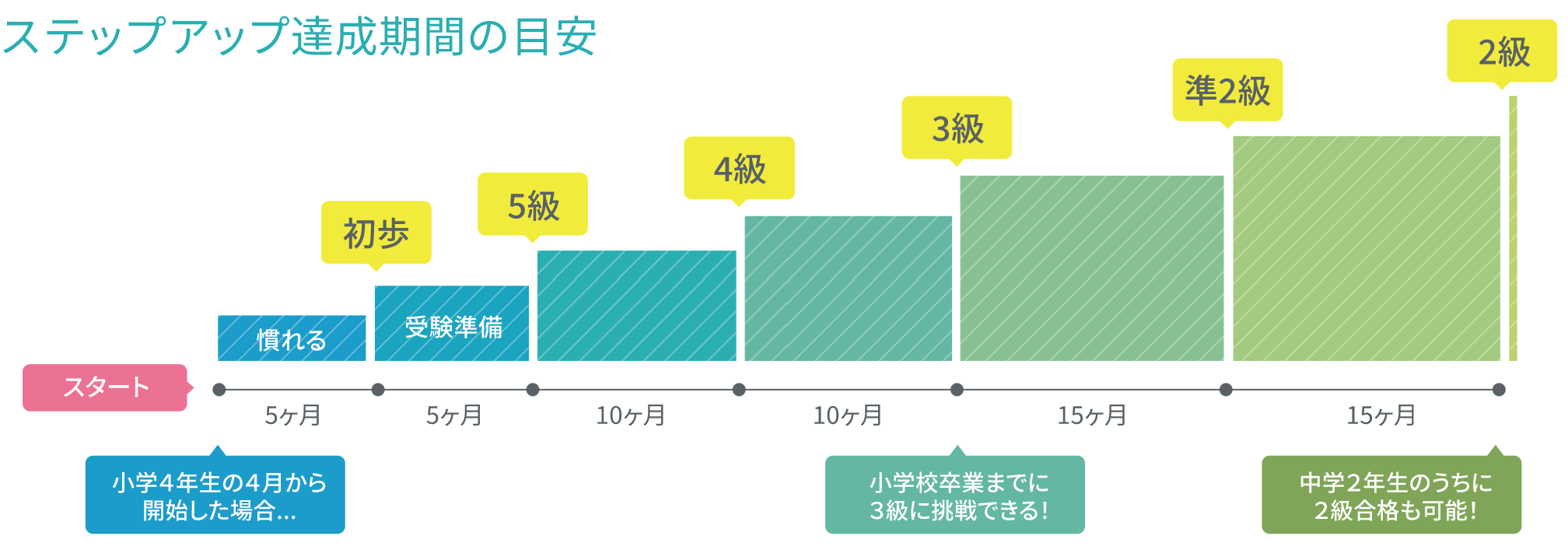 HATSUWA+のカリキュラムは、初心者~英検Ⓡ2級に合格するまで対応しています。