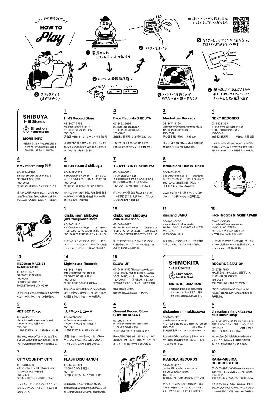 レコードマップは渋谷・下北沢エリアのレコード店をイラストとともに紹介したフリーペーパーです。第1弾を2022年秋にリリースし、FTFが運営する店舗(Face Records、General Record Store)をはじめ、マップ掲載に参加していただいたレコード店で配布していました。各エリアのレコードショップを、イラストとともにマップ形式で紹介する表面、アナログレコードに初めて触れる方でも楽しめる、レコードの聴き方を紹介する裏面で構成されています。今後はさらにレコードバーやカフェなど音楽ファンが集う場所へ設置場所を増加する予定です。
