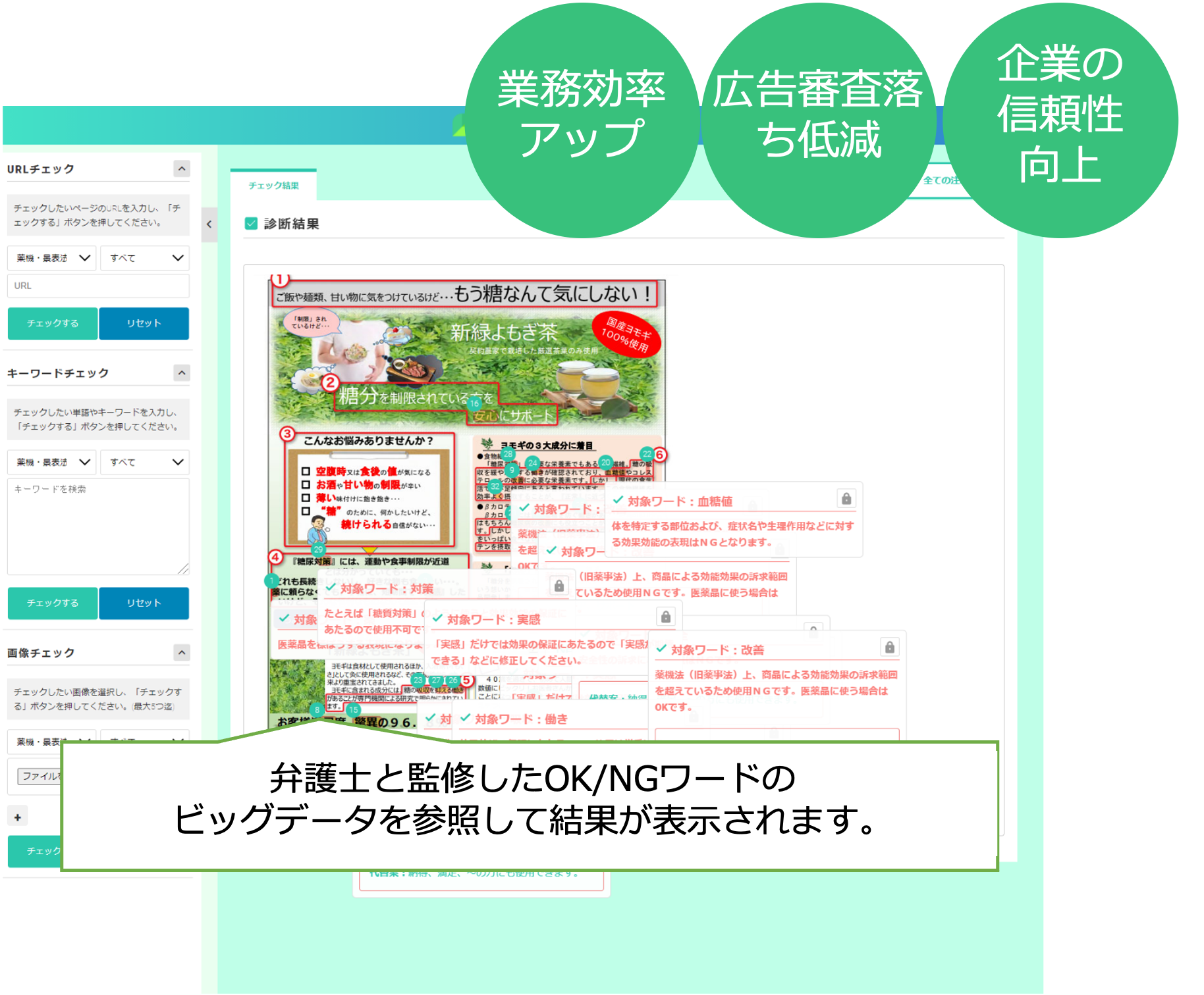 自動でウェブサイトや資料(PDF、JPG、PNG)の文章をチェックできるので、目視監修で2-3日かかる監修をぱっと終わらせることができます。