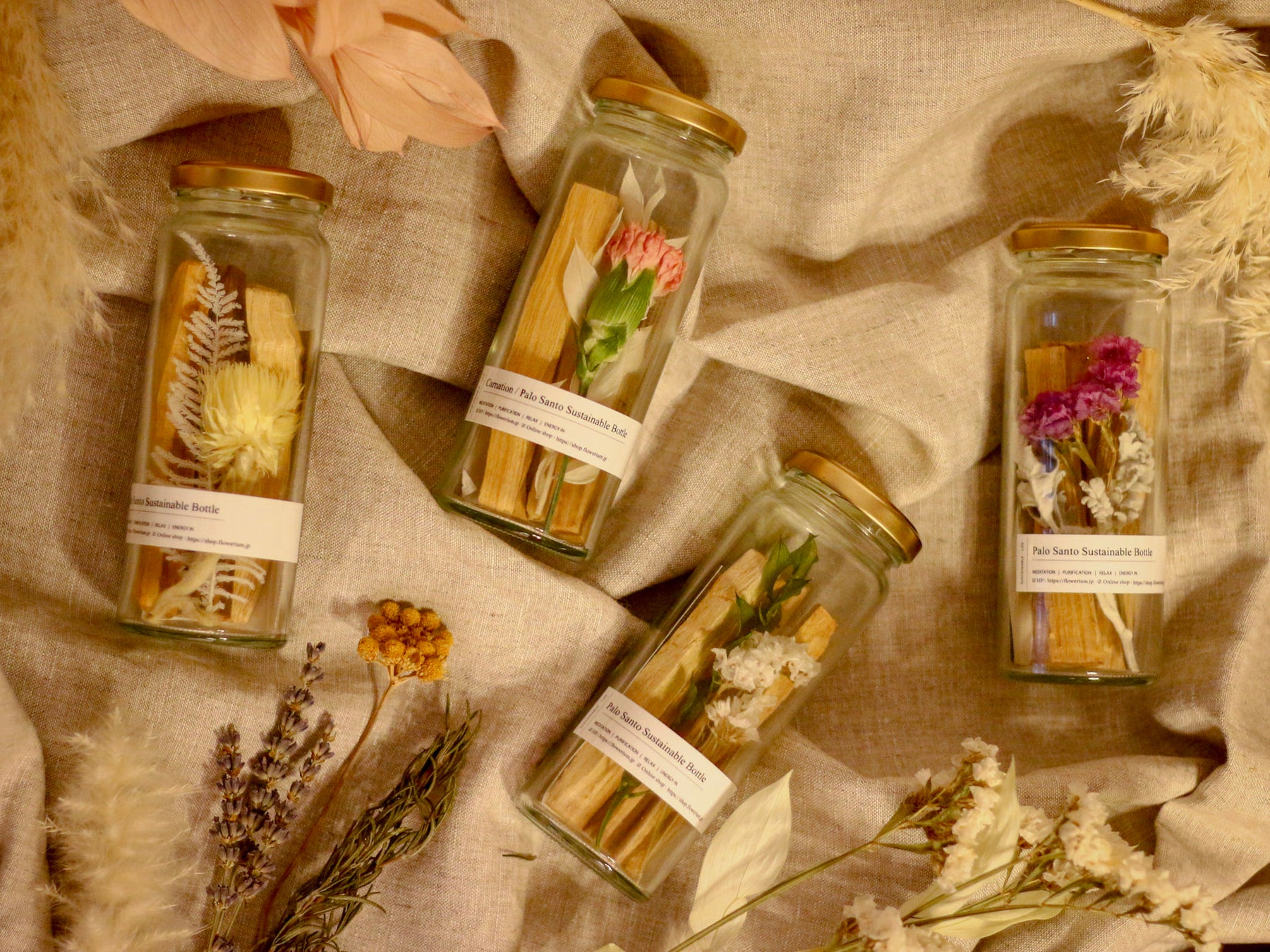 パロサントとロスフラワーを瓶に詰めたインテリアにもなるフラワーボトル。