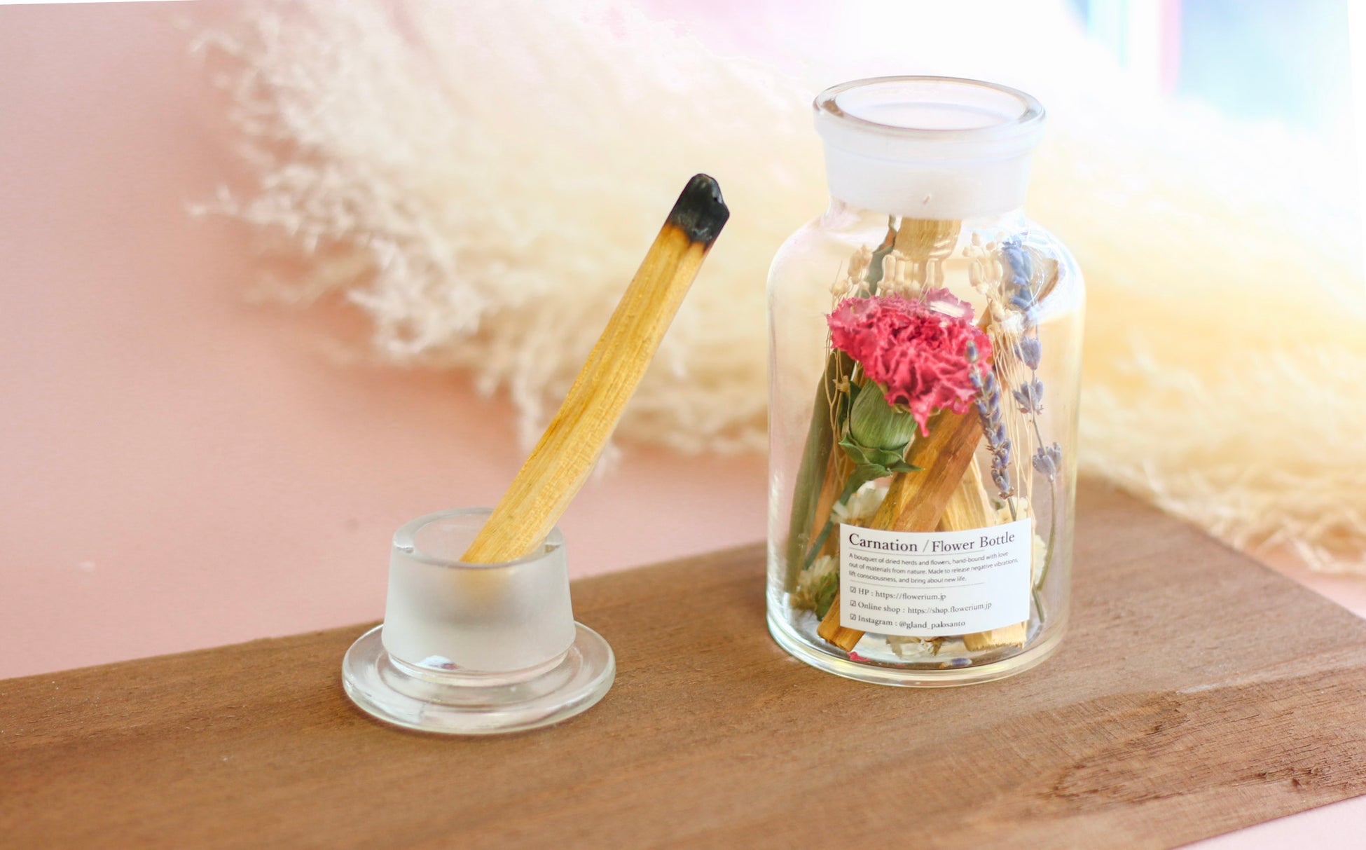 ポジティブなエネルギーを呼ぶという浄化香「パロサント」と、再び命を吹き返したカーネーションのコラボレーションセット。