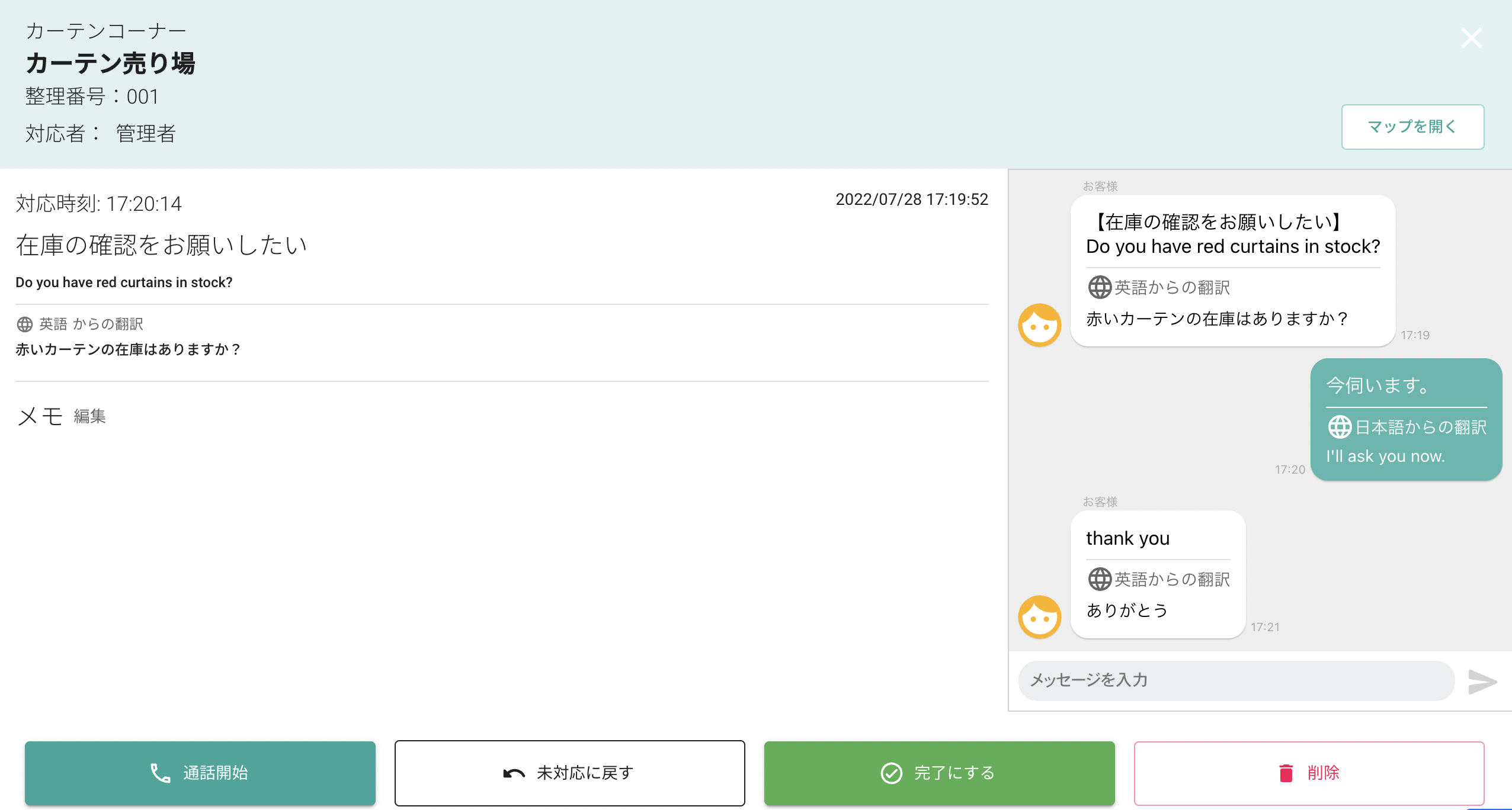 翻訳機能を使って日本語以外の言語で呼び出しをされた場合、スタッフへ通知される呼び出し内容の詳細やお客様とのチャットでのやりとりも相互にリアルタイムで翻訳されます。