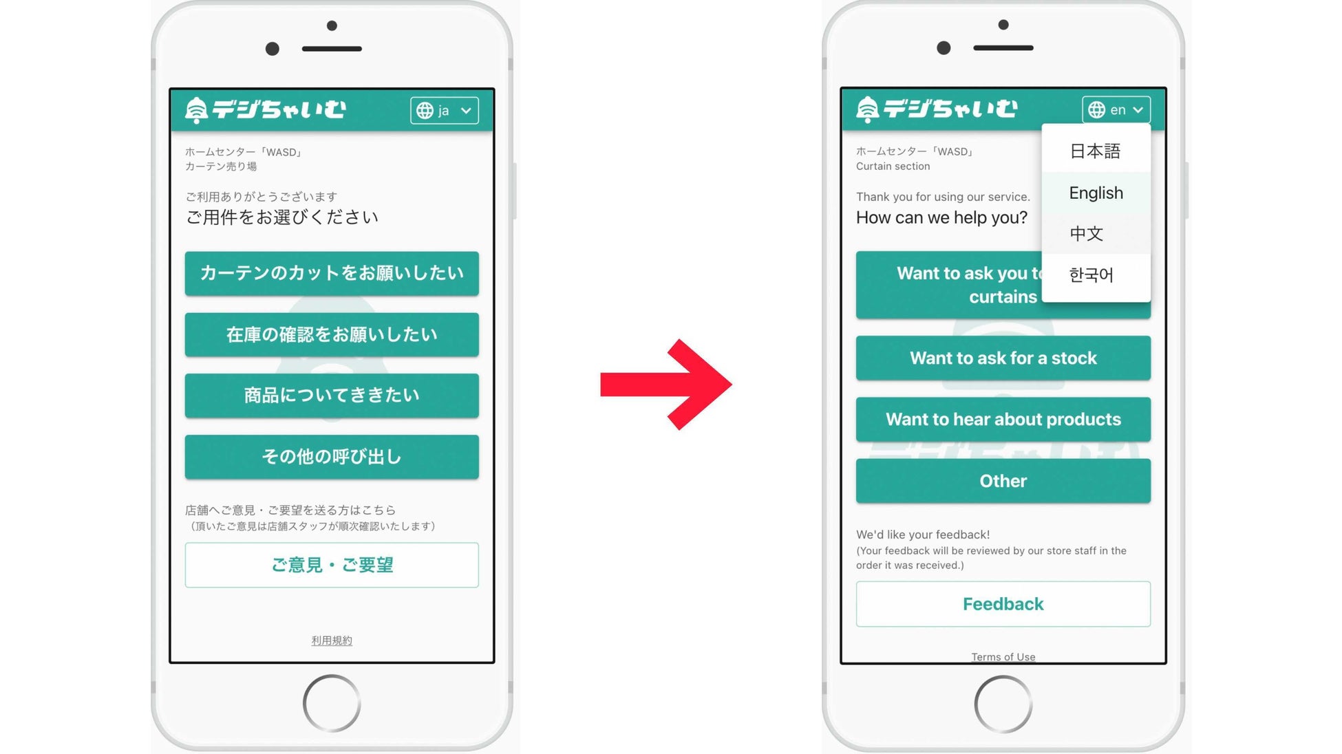 この時、店舗側で設定した「商品について聞きたい」などの呼び出し用件も追加の設定は不要でシステムにて自動翻訳されて表示されます。