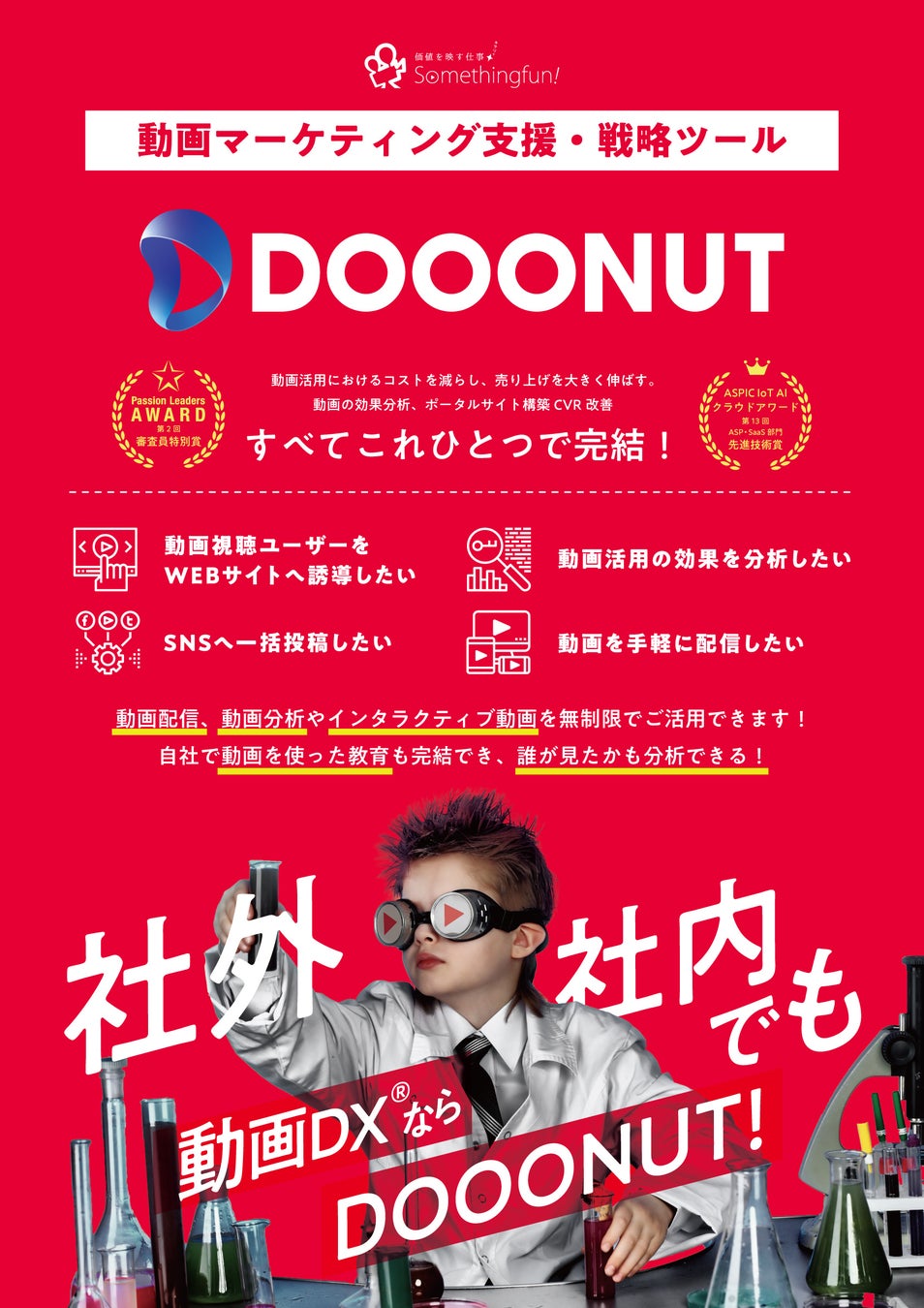 またDOOONUTという動画SaaSによって視聴者のエンゲージメントを高めるインタラクティブ動画を提供し、ビジネスの成果に直結する動画マーケティングや社内教育など、様々なシーンでの動画活用が可能です。クラウド上での制作管理や共同編集により、チーム内での効率的な動画管理が実現します。ビジネスの成果に繋がる動画活用を手軽に実現することができます。