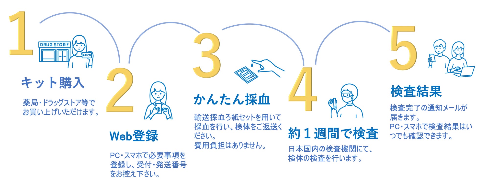 本サービスでは、新型コロナウイルスに対する抗体価を測定し、ワクチンの効果を把握することを目的としています。本サービスは、自宅や学校、職場などで自己採血し郵送することにより簡易に、ワクチン接種後に抗体がどれくらい保持できているか、抗体価のレベルの確認ができます*1。ワクチン接種後の抗体の保持状況には個人差があります*2ので、個人のワクチン接種後の抗体価を管理し安全・安心に日々を送れることに加え、ワクチン接種のタイミング確認にも利用できます。
