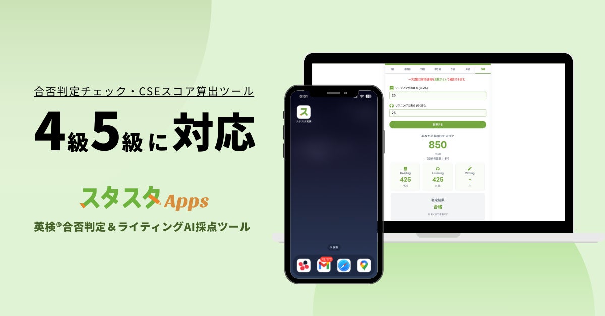 スタディスタジオ株式会社(本社:東京都渋谷区、代表取締役:鈴木孝一、以下「当社」)は、英検®受験生向けに提供しているウェブサービス「スタスタApps」において、英検®4級・5級の合否判定ツール(CSEスコア予測機能)を2025年1月28日に公開いたします。
