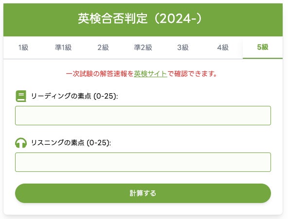 受験生が試験後に解答速報などをもとに自己採点し、正答数を入力。4級・5級はライティングが含まれないため(現行の試験形式において4級・5級ではライティング問題がない)、素点入力はリーディング、リスニングそれぞれの正答数のみが対象となります。