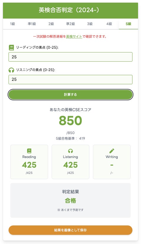 これにより、従来公開していた1級・準1級・2級・準2級・3級に加え、英検®のすべての級(1級~5級)で、リーディング・リスニング・ライティングなどの素点から合否の目安となるCSEスコアを算出可能となりました。