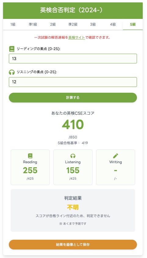 4級・5級ではライティング問題がないため、自己採点対象はリーディングおよびリスニングの2セクションです。問題数と配点がシンプルである分、入力項目も少なく、利用者には抵抗感なく使っていただける設計となっています。