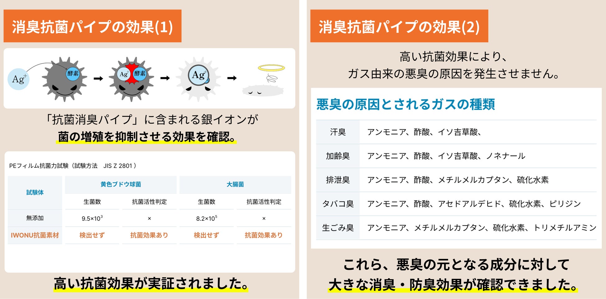 この「抗菌消臭パイプ」は、菌の増殖抑制効果があり、強力な消臭/防臭効果がデータで実証されています。