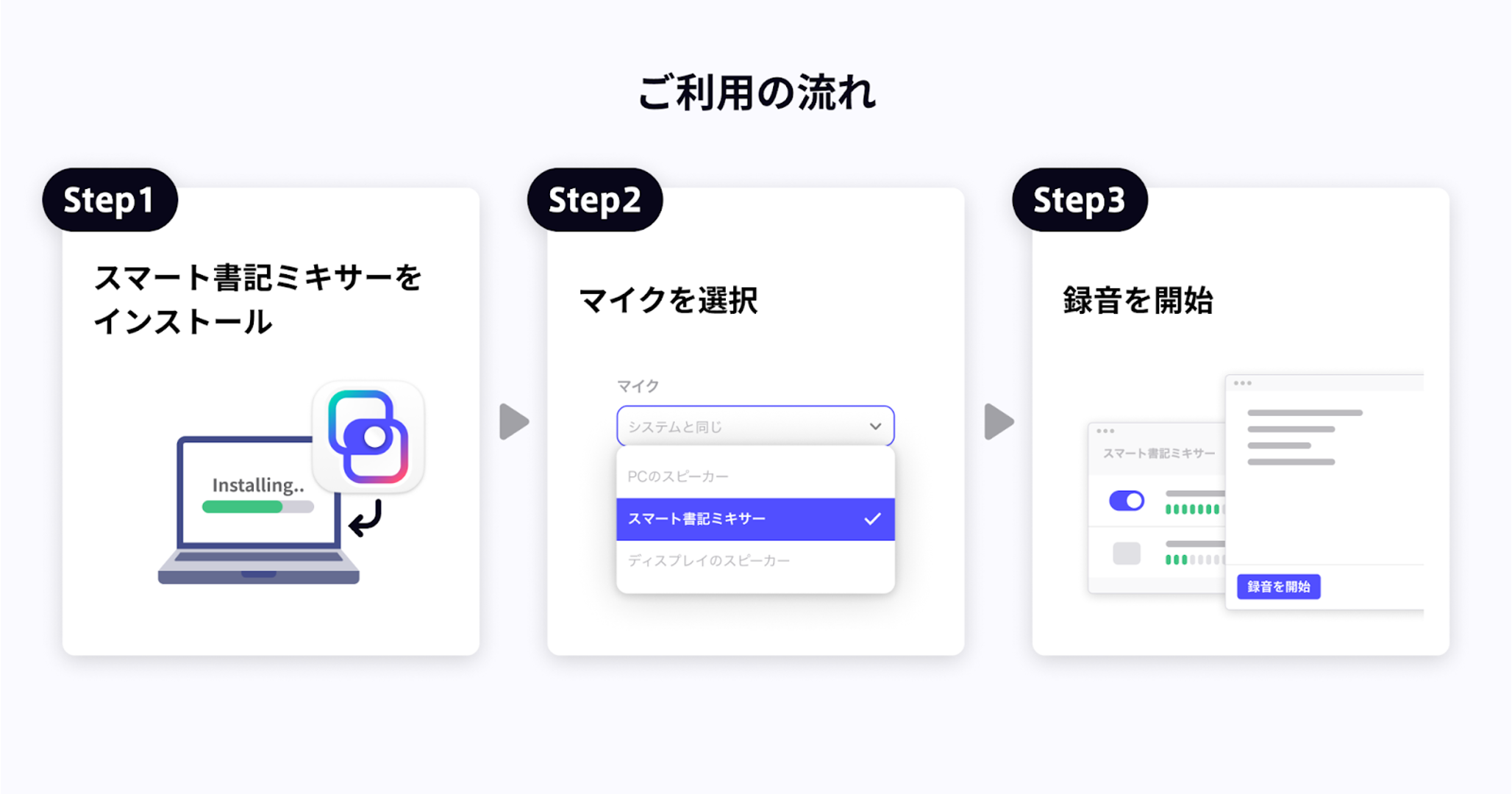 「スマート書記ミキサー」は、これらの煩雑な事前準備を全て不要にし、会議の開催形式を気にすることなく、シンプルな操作で「スマート書記」での記録をすぐに開始できます。これにより、リモートワークでもオフィスでも、働く場所にとらわれずストレスなく会議に参加できるだけでなく、議事録作成の効率を大きく向上させます。