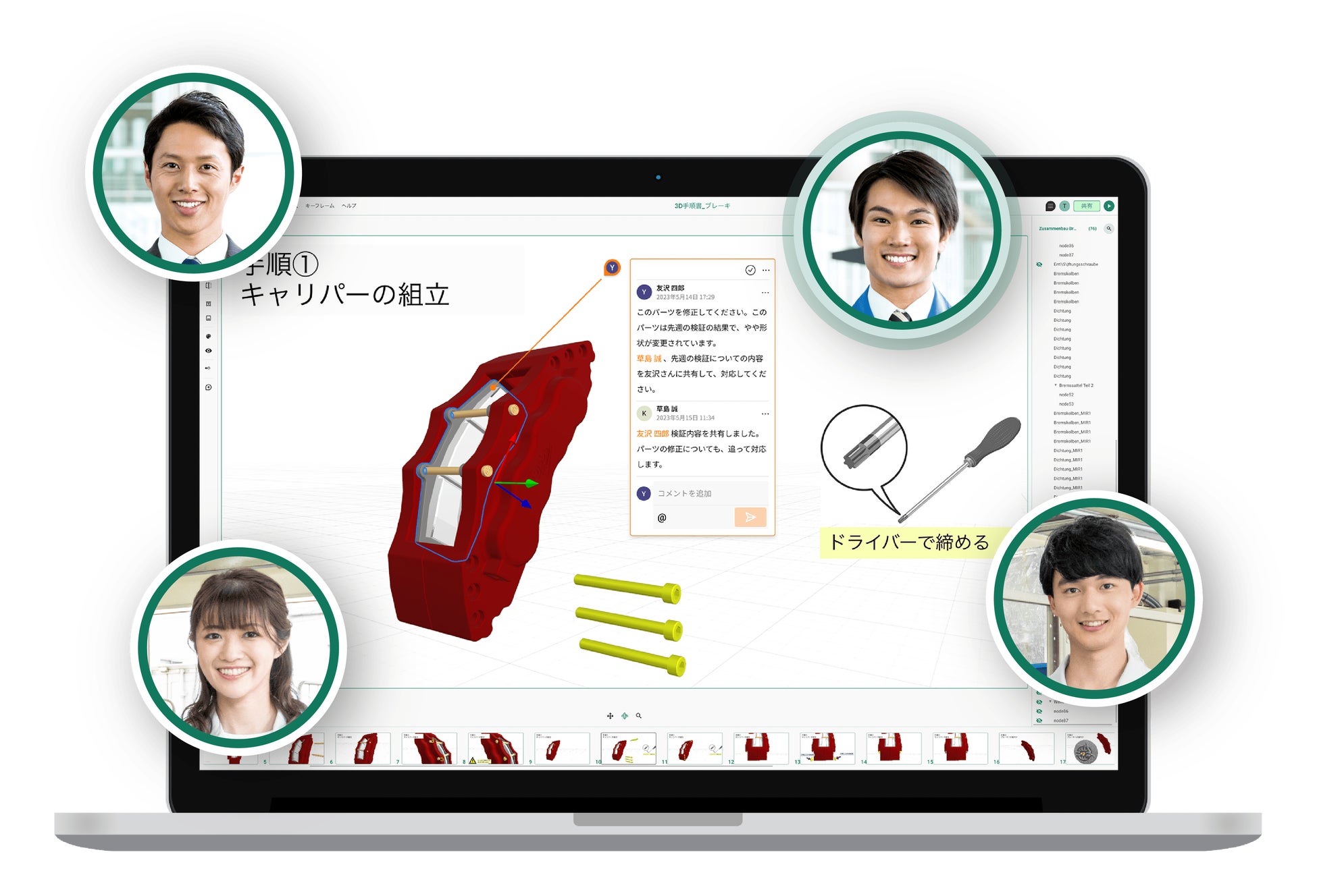 早速、製造部のBさんがURLをクリックし3D資料を開きました。閲覧のためのアプリやハイスペックPCが不要なので外出先からも閲覧できます。また、アニメーション付きの3D資料なので工程を素早く理解できました。