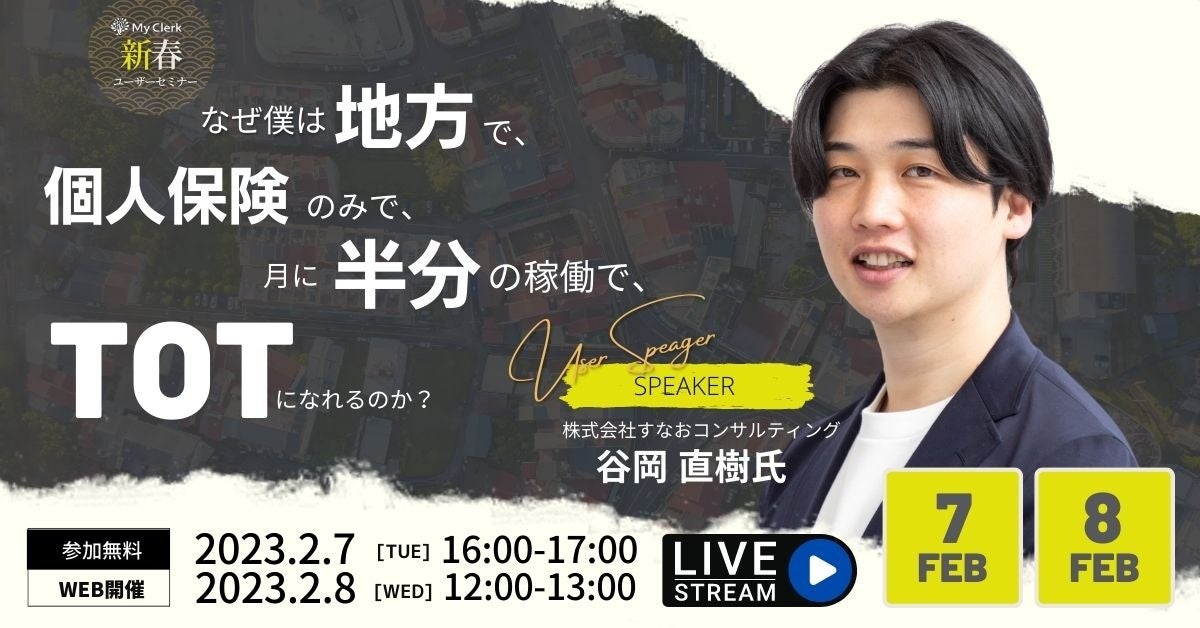 保険業界専⾨オンライン秘書サービス My Clerk(マイクラーク)を展開する 株式会社マイクラーク(宮城県仙台市 代表取締役 北川英之 https://myclerk.net/ 、以下 マイクラーク社 )は、株式会社すなおコンサルティング株式会社 代表取締役 ⾕岡直樹⽒をゲストに迎えた新春ユーザーセミナーを2月7日(火)16:00-17:00・8⽇(⽔)12:00-13:00に追加開催することを決定しました。