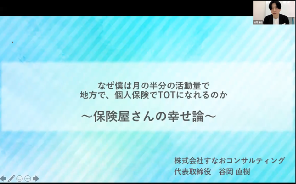 「個⼈保険販売全国1位」の経歴を持つ⾕岡⽒に⽉の半分の稼働でTOT基準を達している秘訣を発表いただくという新春