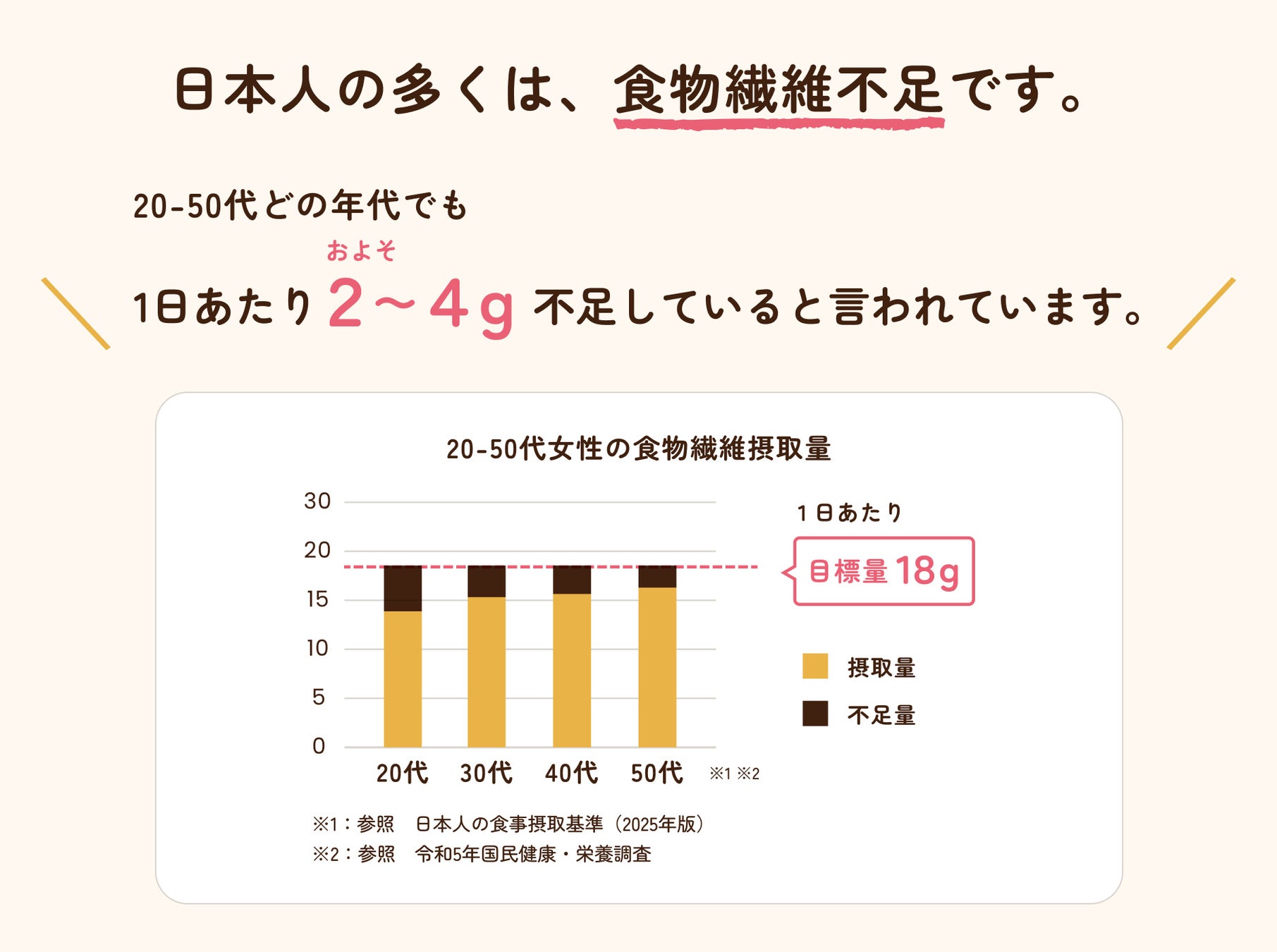 玄米ヨーグルトに含まれる食物繊維は、100ℊ当り6.7ℊ。本品約1/6パックで不足分の食物繊維を補うことができるので、毎日の食物繊維習慣にもおすすめです。