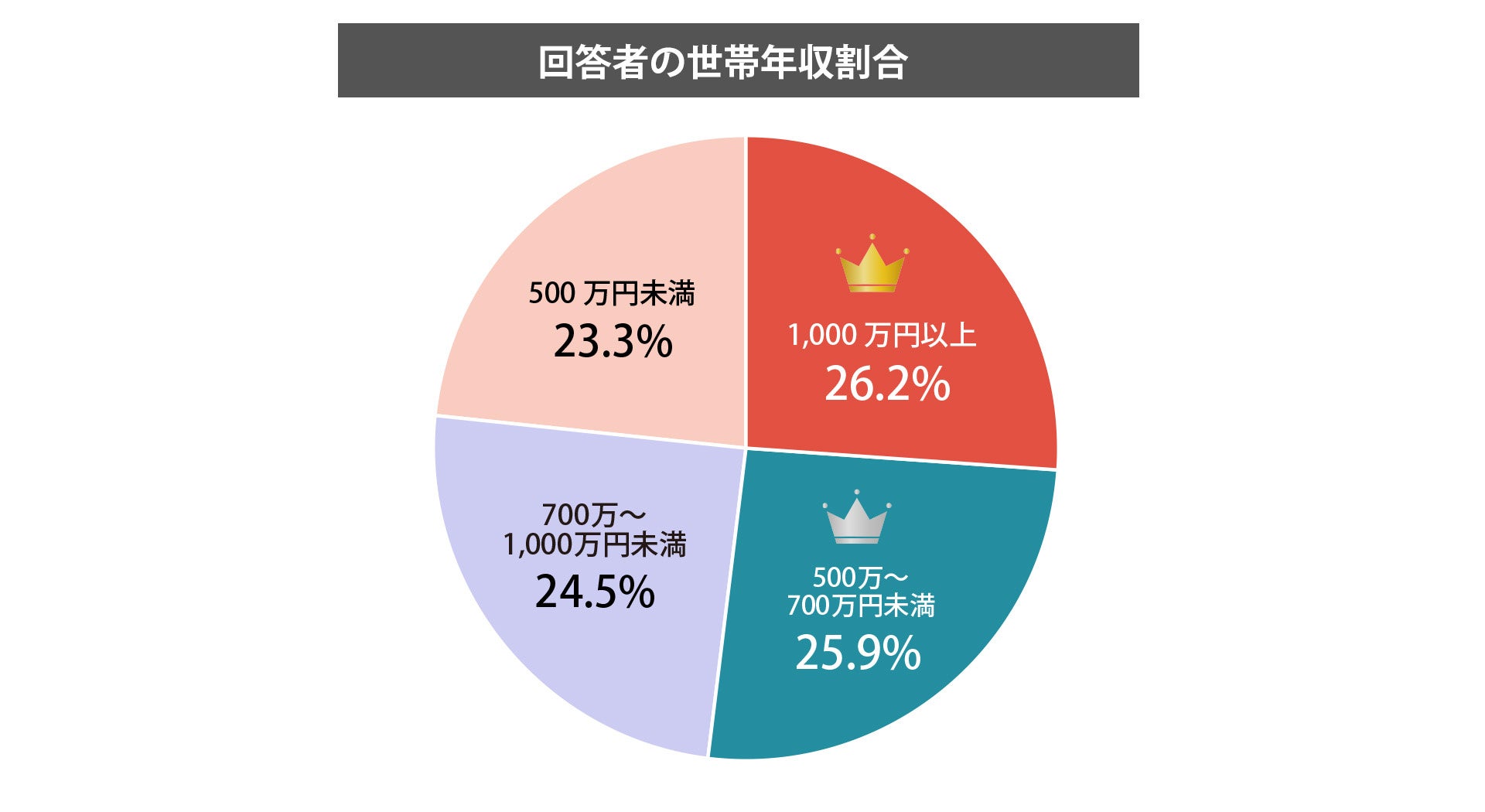 購入経験者で一番多かった世帯年収の割合は「1000万円以上」で26.2%。第2位は「500万~700万円未満」で25.9%という結果でしたが、全体的な世帯年収割合を見ると、それ程大きな差はなく、それぞれ2割前後を占める結果となりました。
