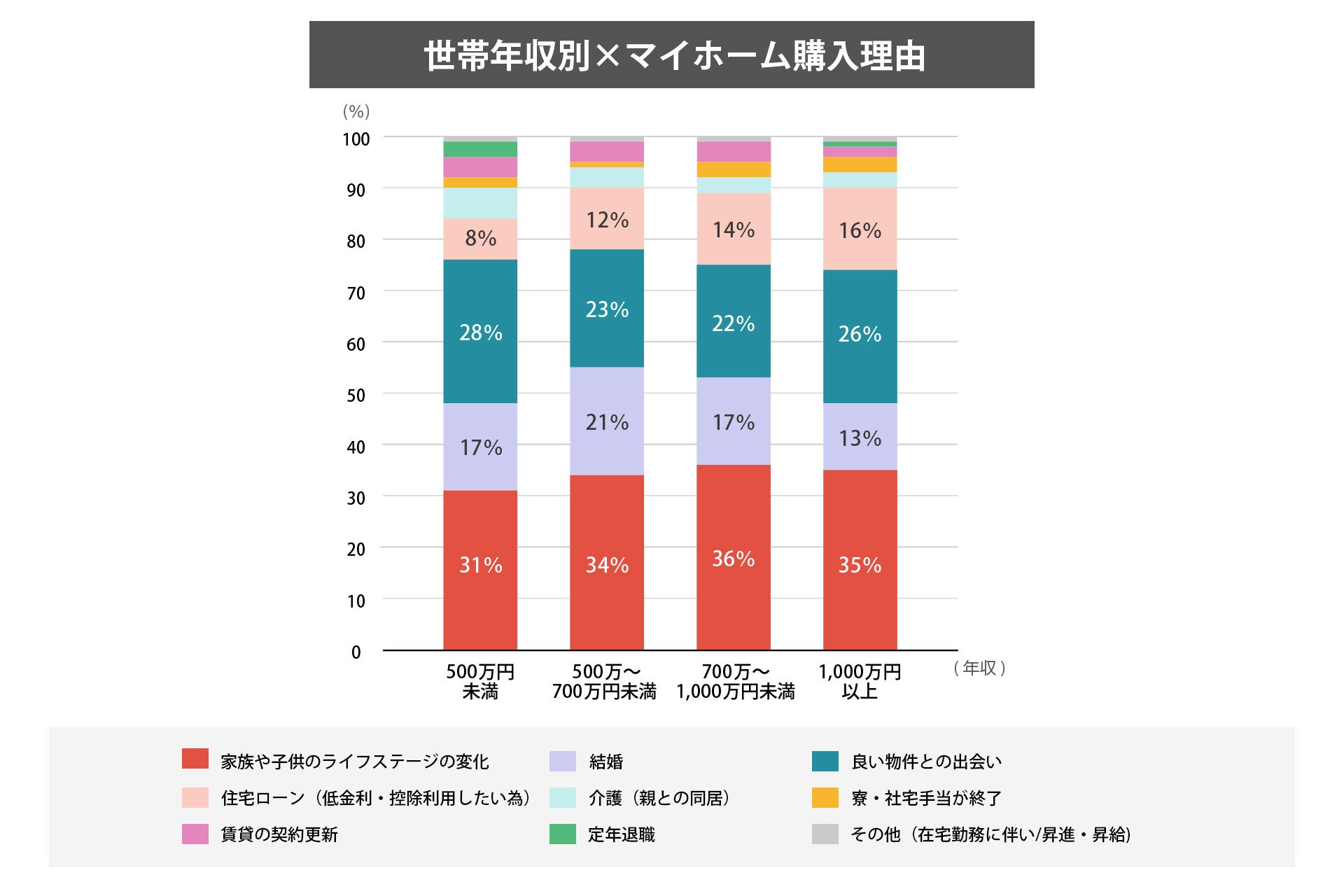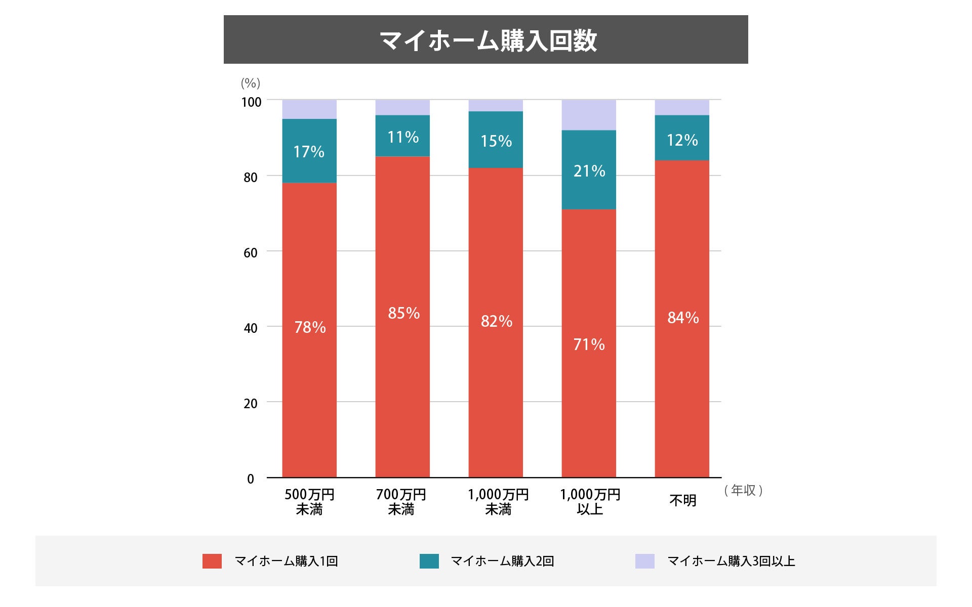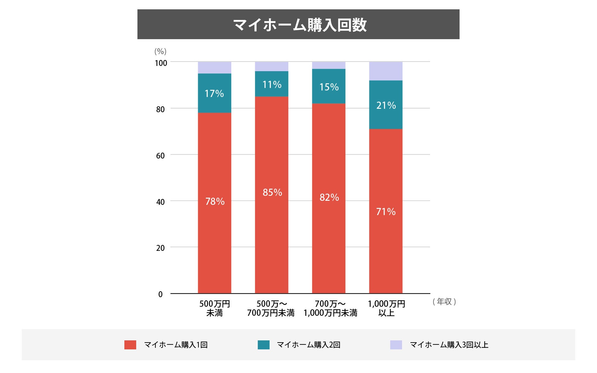 複数回マイホームの購入を経験している人は、「世帯年収が高いのではないか?」という印象を持たれる方も多いと思いますが、実際は年収に比例していない事がわかりました。年収に関係なく、ライフスタイルの変化に応じて柔軟に住み替えをしている人は意外と多いようです。