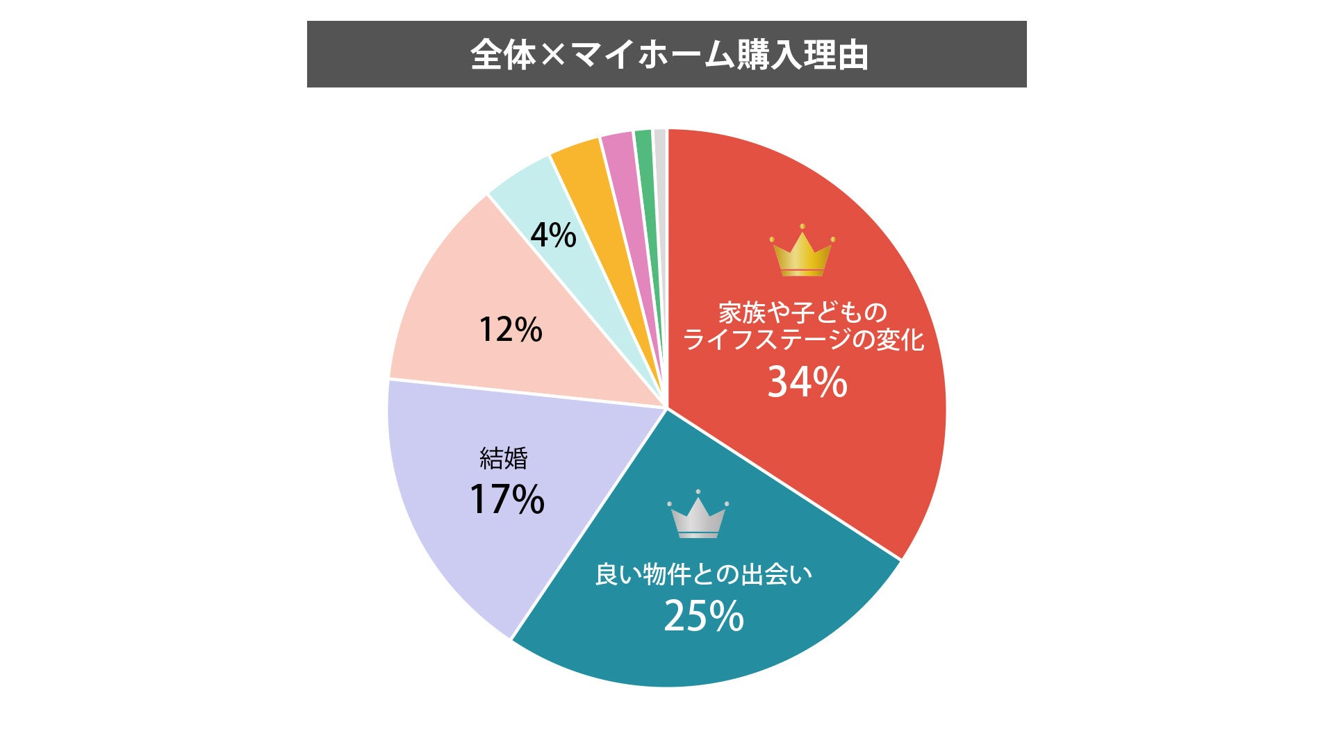 全体的な割合を見ると、第1位は「家族や子どものライフステージの変化」が約3割を占めています。第2位に「良い物件との出会い」(25%)、第3位が「結婚」(17%)という結果になりました。
