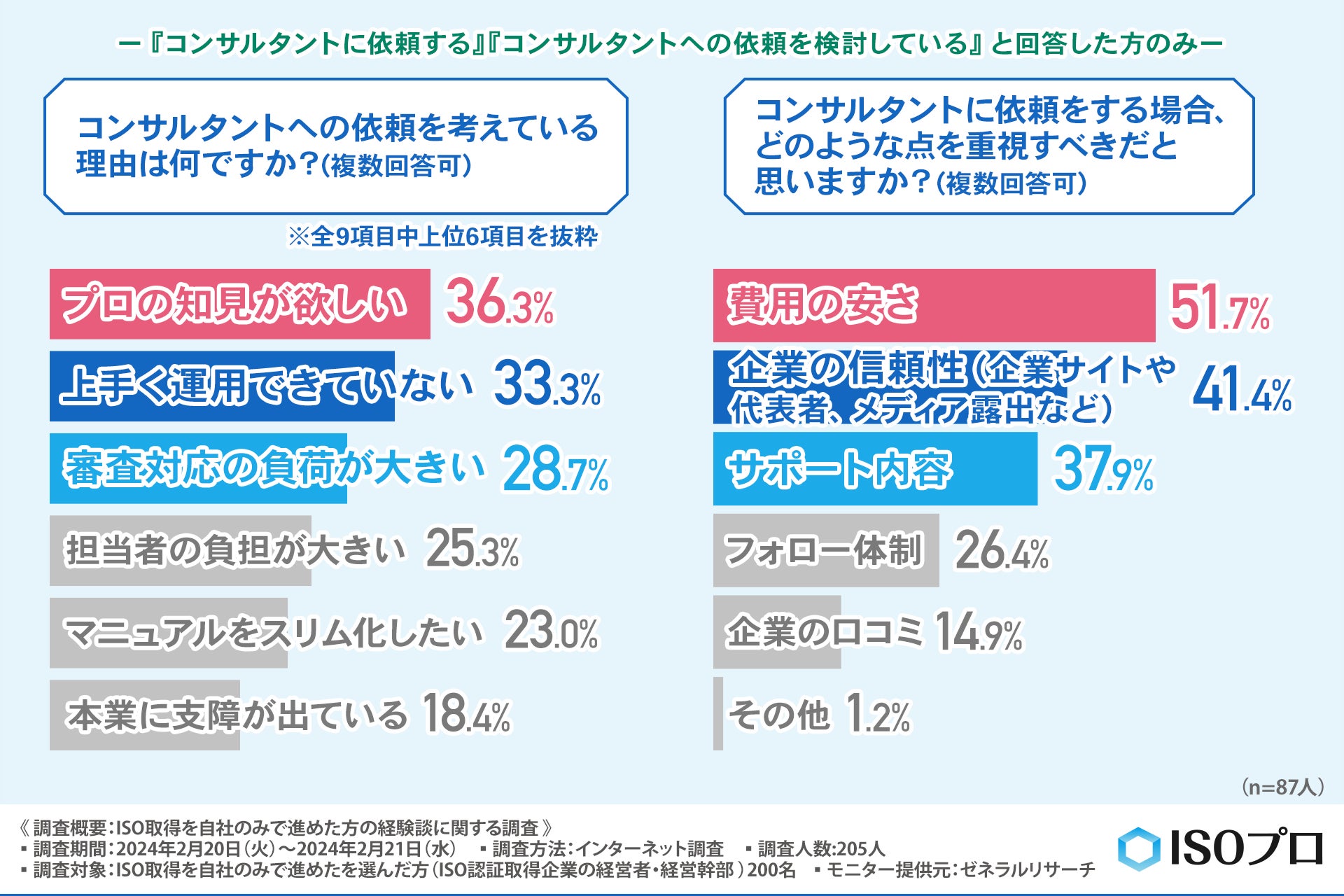 さらに、前回実施した「ISO認証取得とコンサルティング企業についての経験談」に関する調査(https://prtimes.jp/main/html/rd/p/000000013.000055385.html)では、ISO認証取得を外部のコンサルティング企業へ依頼した企業の、依頼した理由や満足度などが明らかになりました。