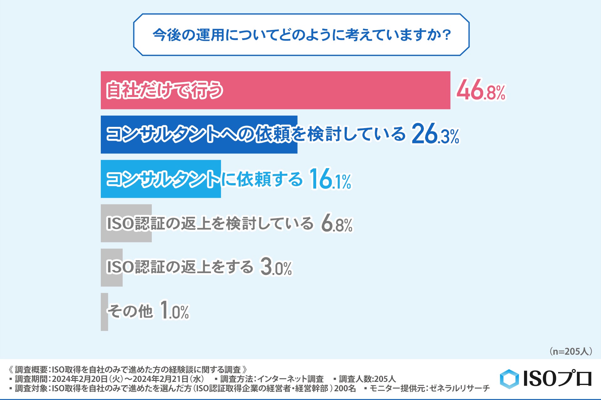 「今後の運用についてどのように考えていますか?」と質問したところ、『自社だけで行う(46.8%)』と回答した方が最も多く、『コンサルタントへの依頼を検討している(26.3%)』『コンサルタントに依頼する(16.1%)』と続きました。