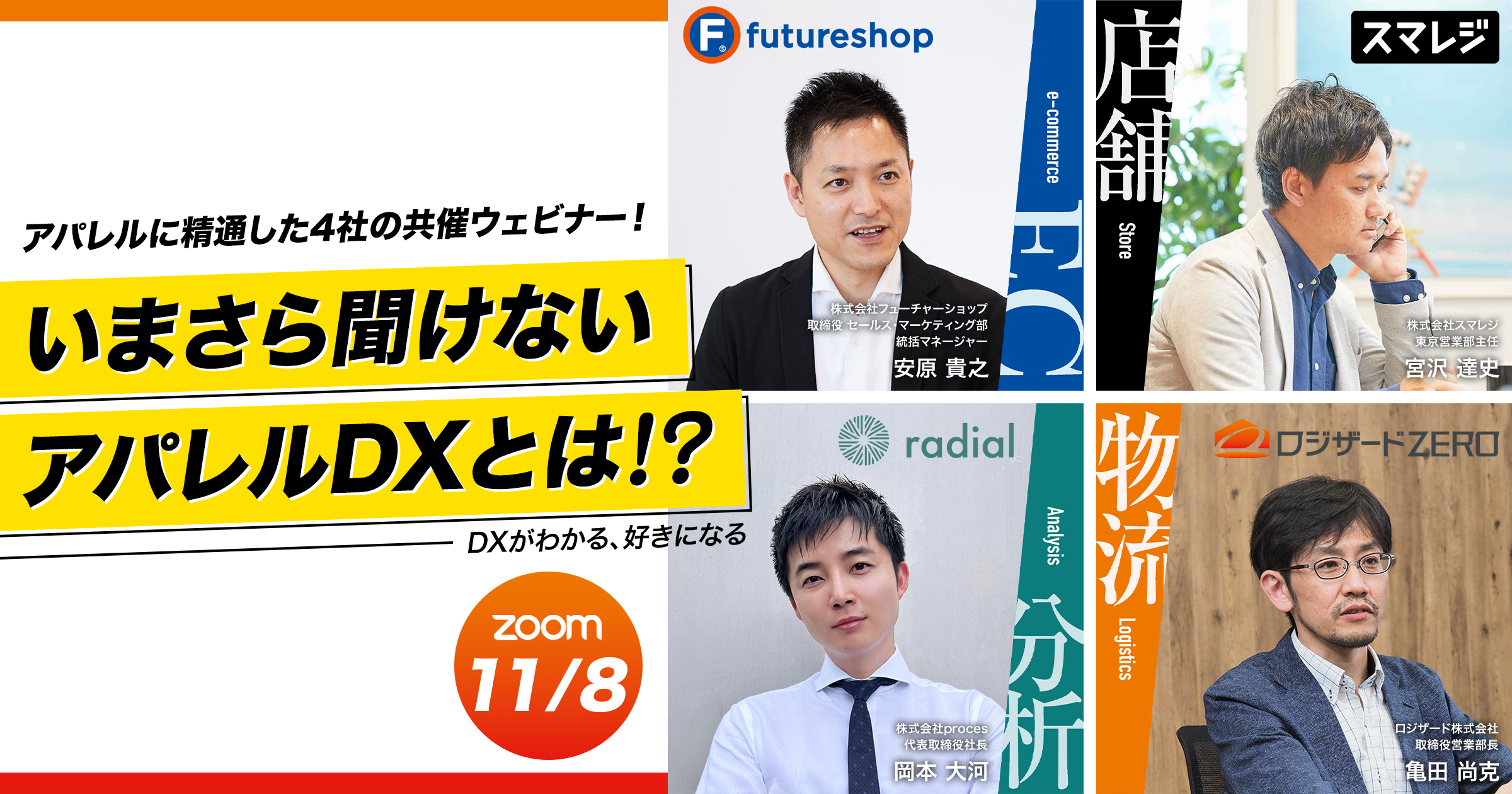 2022年11月8日(火)14:00より、株式会社proces・株式会社スマレジ・ロジザード株式会社・株式会社フューチャーショップの4社で「いまさら聞けないアパレルDXとは!? ~DXがわかる、好きになる~」をテーマに合同ウェビナーを開催します