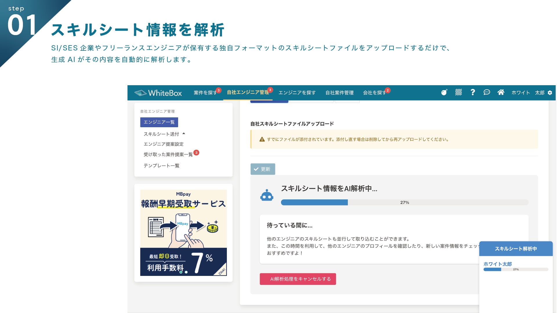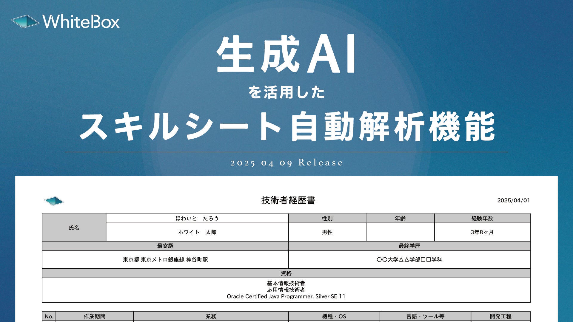 株式会社WhiteBox(本社:東京都渋谷区、代表取締役社長:川原 翔太)は、IT業界向けマッチングプラットフォーム「WhiteBox」において、生成AIを活用した「スキルシート自動解析機能」を2025年4月9日より提供開始することをお知らせいたします。