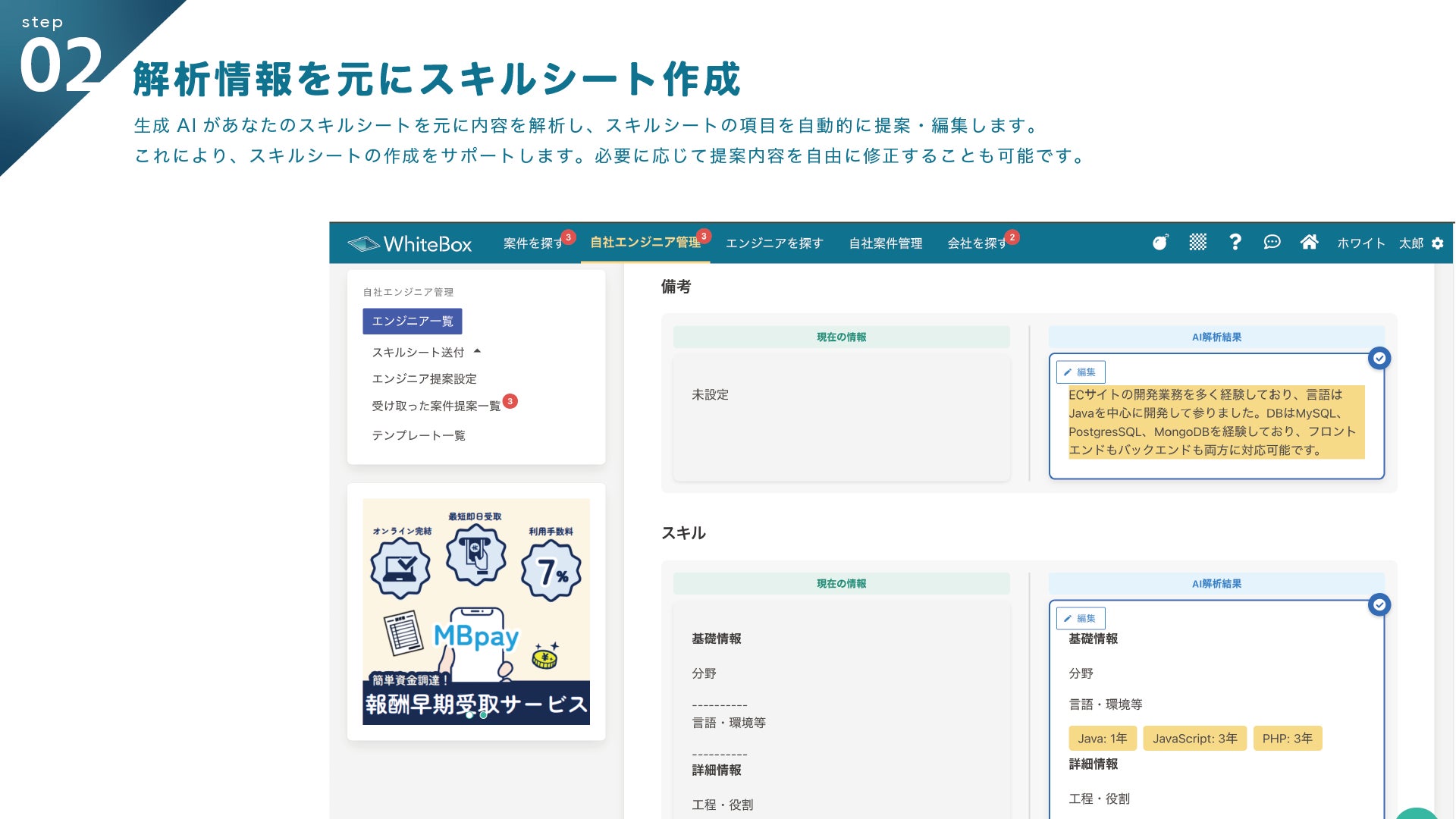 WhiteBoxでは、すでに案件内容の自動入力などでも生成AIを活用しており、今回の「スキルシート自動解析機能」はその拡張となります。今後もAI技術を積極的に活用し、多重下請け構造の解消や業務効率化に貢献してまいります。