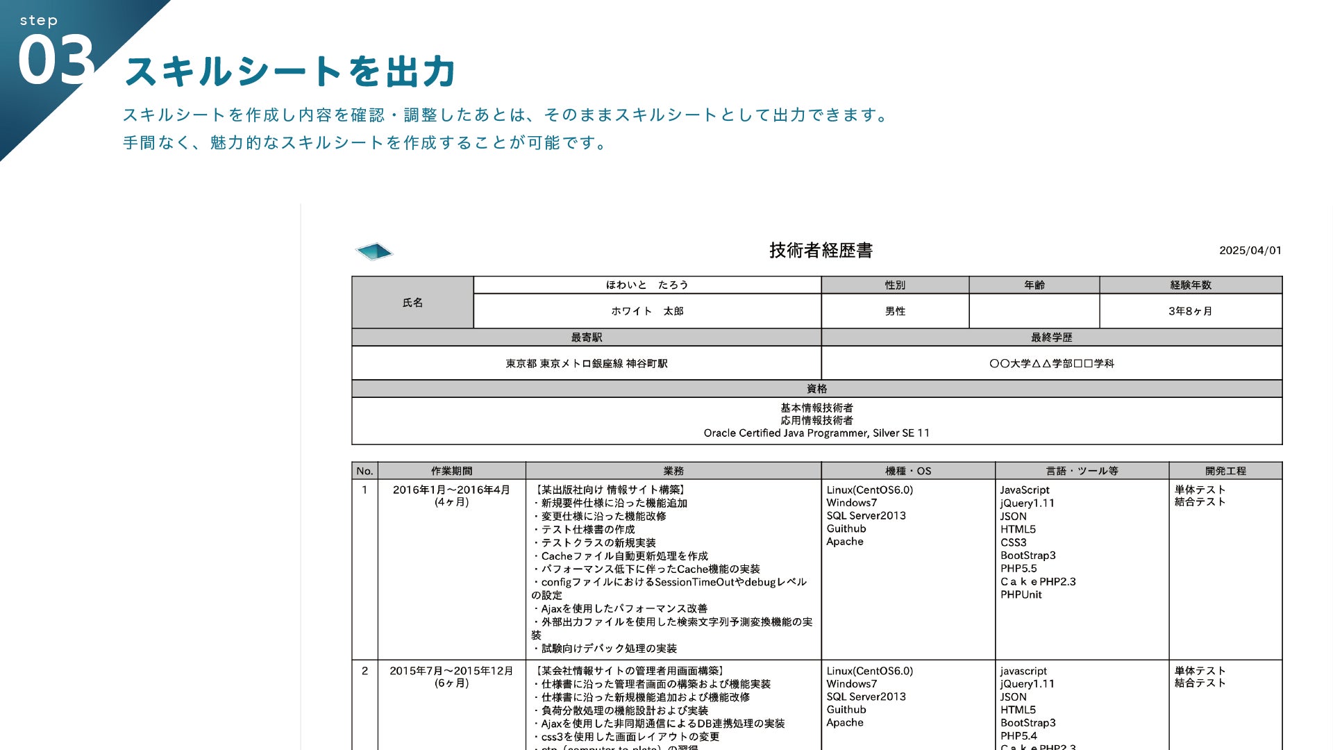 入力工数の削減:スキルシートの手動入力作業が不要になり、業務効率が大幅に向上。