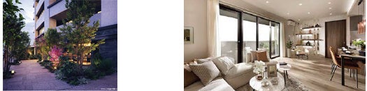 本物件の外観は、ホワイトとグレーを基調としたぬくもりある素材を採用し、花が咲くものや葉色の明るい常緑樹をベースにした植栽を施すことで、藤沢の景観に馴染む洗練されたデザインとしています。