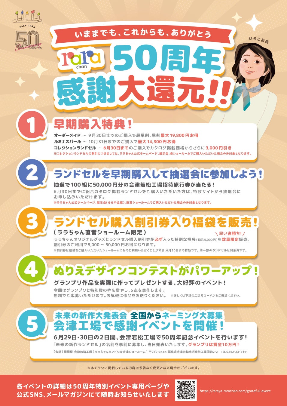 【ララちゃんランドセル】50周年感謝大還元!早期購入割引や抽選で会津若松工場ご招待旅行券など、5つの特典やイベントを実施