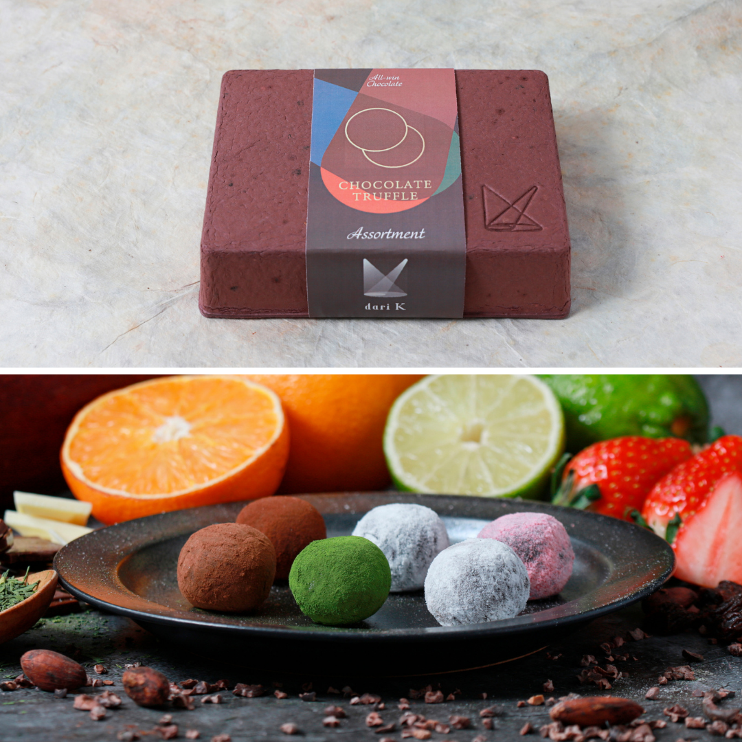 パッケージの素材は、製造工場で収集された古紙の他、カカオ豆からチョコレートを製造する過程で副産物として生じるカカオハスク(カカオ豆の薄皮)を使用しています。通常廃棄されるカカオハスクを使用することで、チョコレートのパッケージとして新たな価値を付与するというアップサイクルを実現しています。