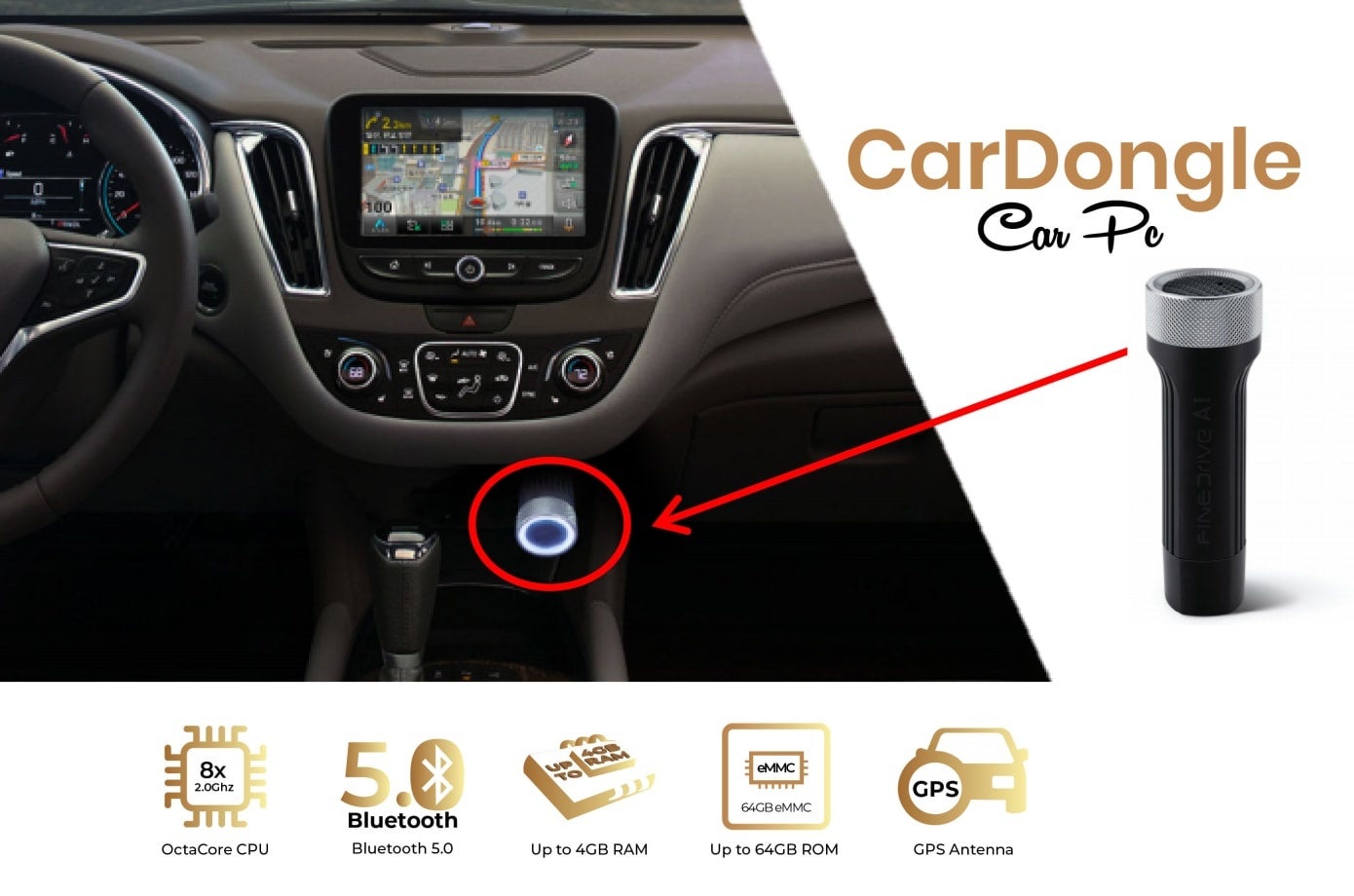 【CarDongle】の本体に4GBRAM+64GBROMを内蔵し小型PC並みの高性能化を実現します。
