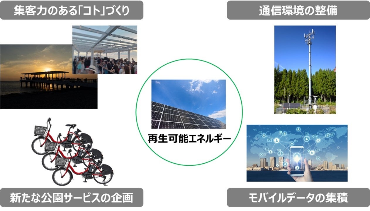 ドコモは、再生可能エネルギー設備の敷設や通信環境整備およびICTソリューション活用による都市公園の高度化の検討を行ってまいります。