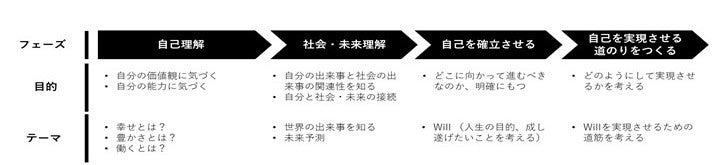 原体験の振り返りや「答えのない問い」への取り組みを通して、自己理解を深め、社会と自分との接続を予測し、自分のWillを見出して言語化します。Will設定には独自のチェックポイントもあり、より質の高いWillまでブラッシュアップします。