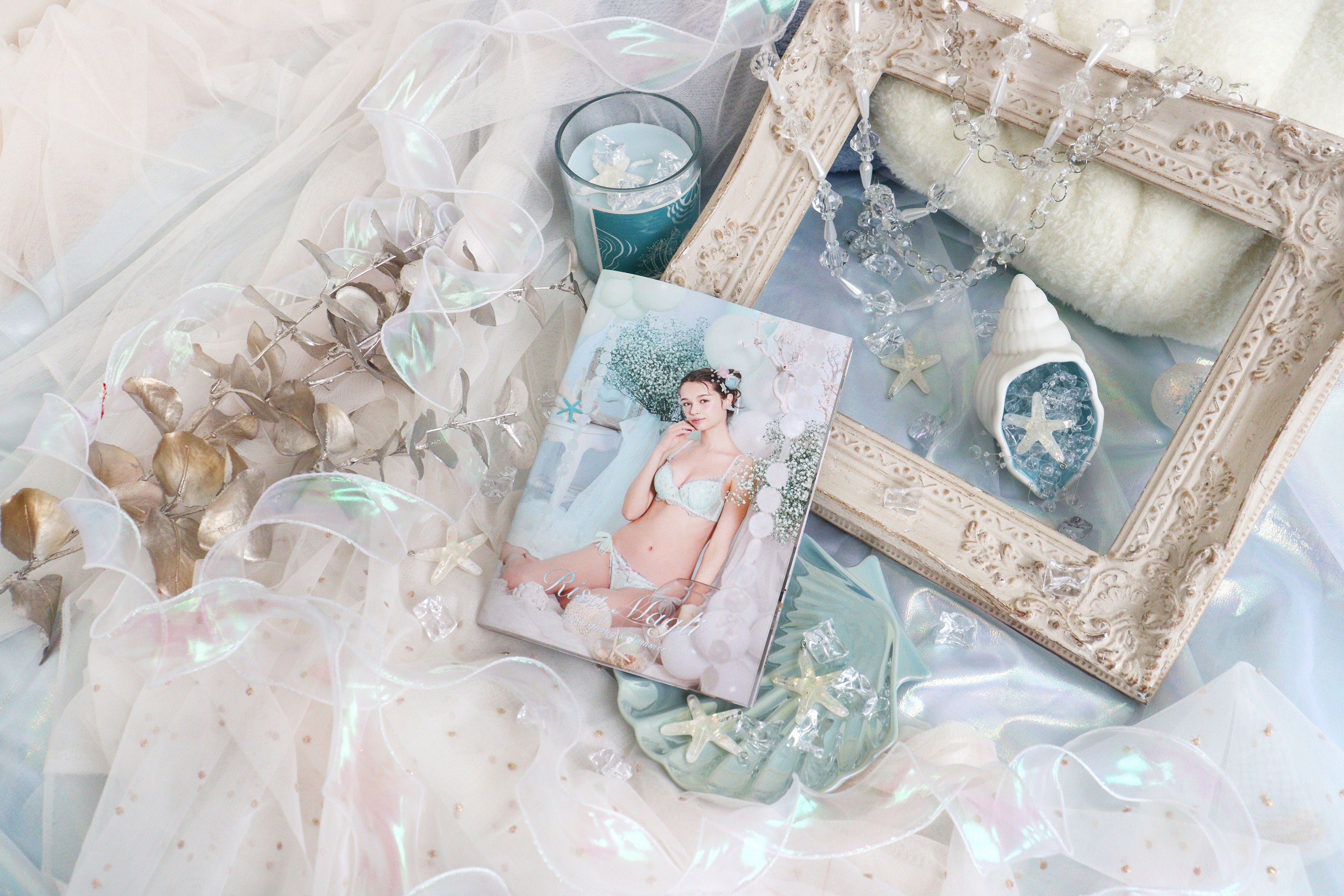 海の中の水疱をイメージに、リサマリが得意とする、お花モチーフは使用せず、円形の柄で立体感を持たせ、カラフルな印象に仕上げたレースが注目のポイントとなります。さらに、レースの印象を背景で表現しました。カタログで水疱は海のカラーと統一されたバルーンで表現され、小物は海のイメージを大切にし、透明感や煌めきを意識しています。ヘアーアクセサリーも球体に拘り、円いチュールや、透明感のあるビーズなどやヒトデをあしらいました。
