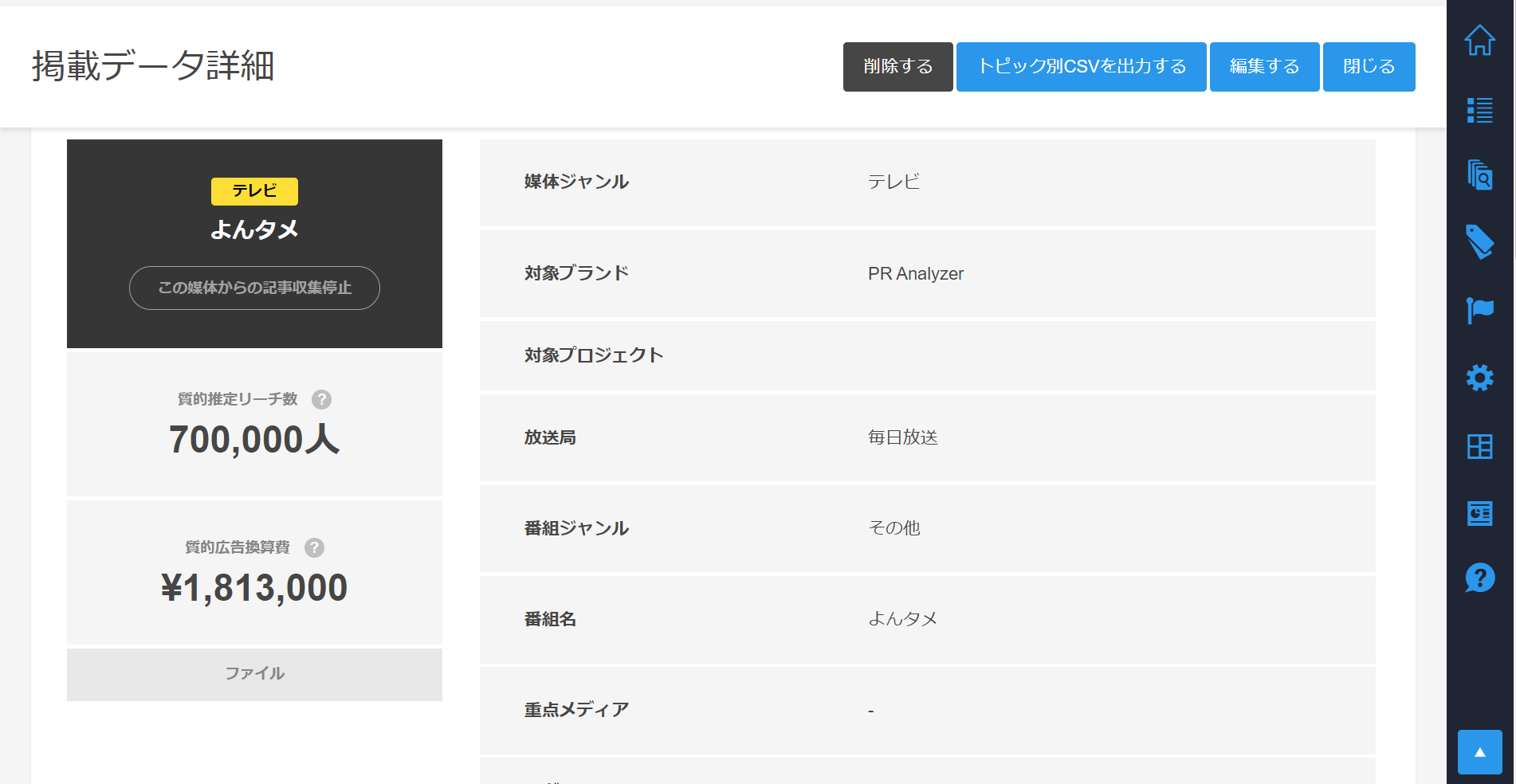 PR Analyzerを導入している企業の6.5%が関西に本社を構えており、関西に支社を持つ企業も多いため、関西エリアのテレビクリッピングは広報担当者にとって重要であることから開発に至りました。関西エリアのテレビ局で番組露出した際、広報担当者は、掲載時期・内容の確認や広告換算費の算出を手動で行ったり、クリッピング会社に別途依頼したりする場合がありました。今後は掲載情報が自動でクリッピングされるため、掲載確認やリーチ数、広告換算費算出の工数が大幅に削減されます。